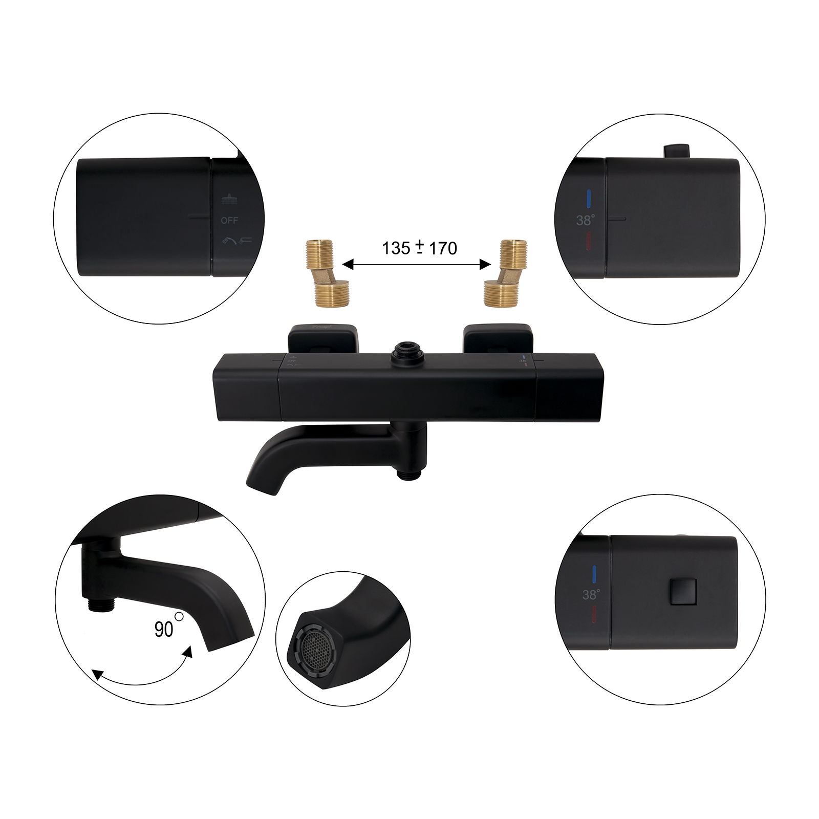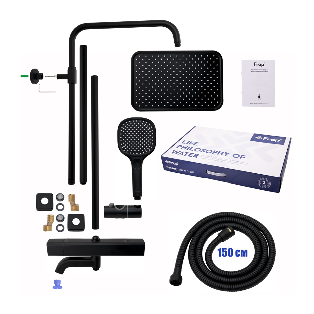 Комплектациясмеситель, душевая стойка, верхний душ, душевая лейка, душевой шланг, держатель для душевой лейки, настенный держатель, отражатели, эксцентрики