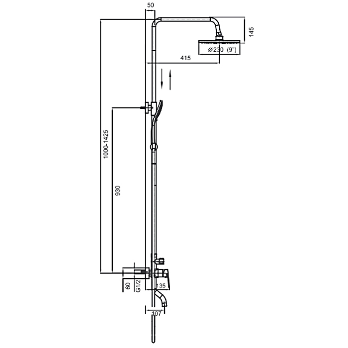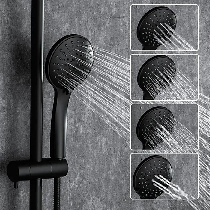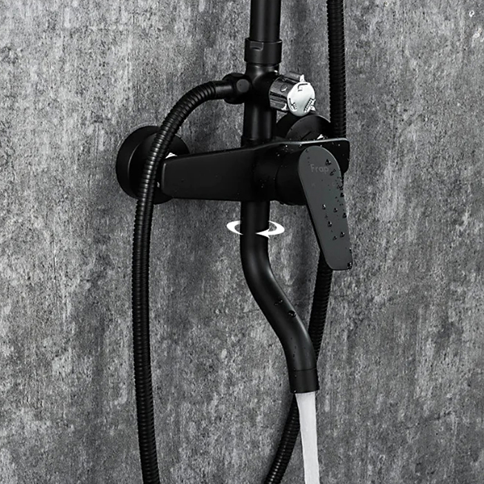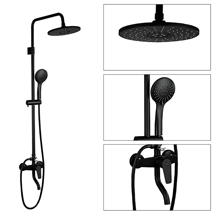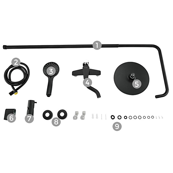 Комплектациясмеситель, душевая стойка, верхний душ, душевая лейка, душевой шланг, держатель для душевой лейки, настенный держатель, отражатели, эксцентрики