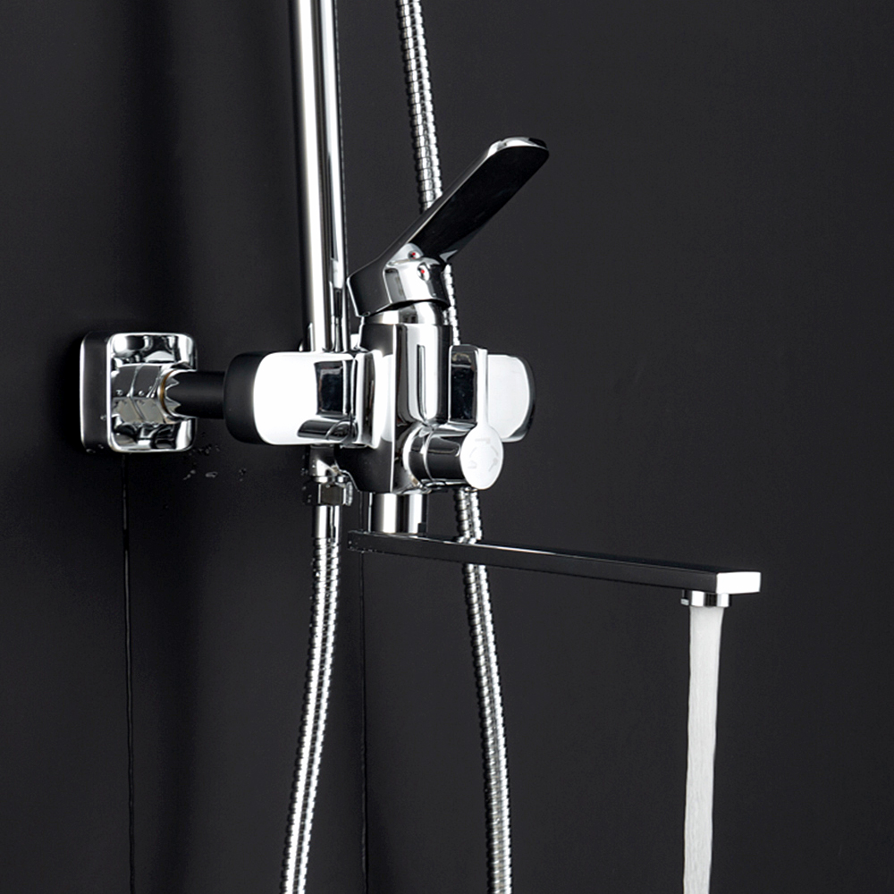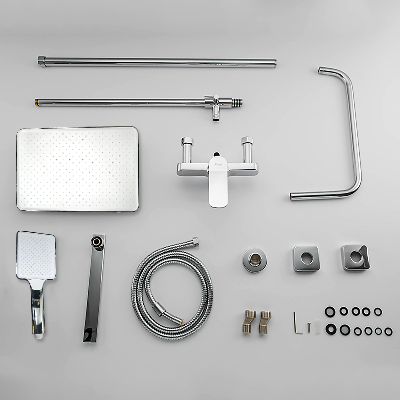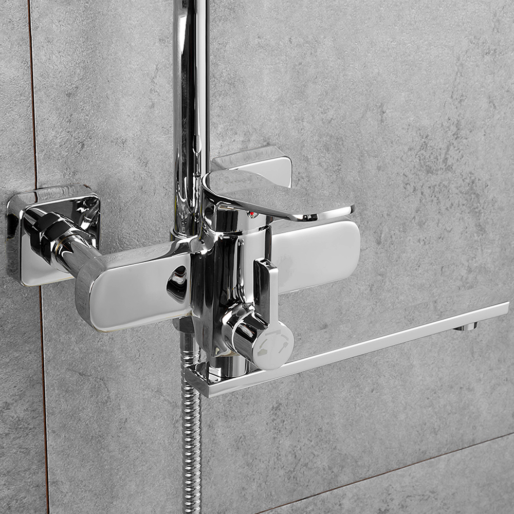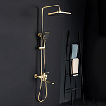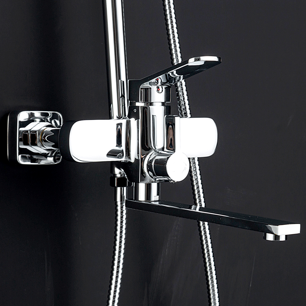 Комплектациясмеситель, душевая стойка, верхний душ, душевая лейка, душевой шланг, держатель для душевой лейки, настенный держатель, отражатели, эксцентрики