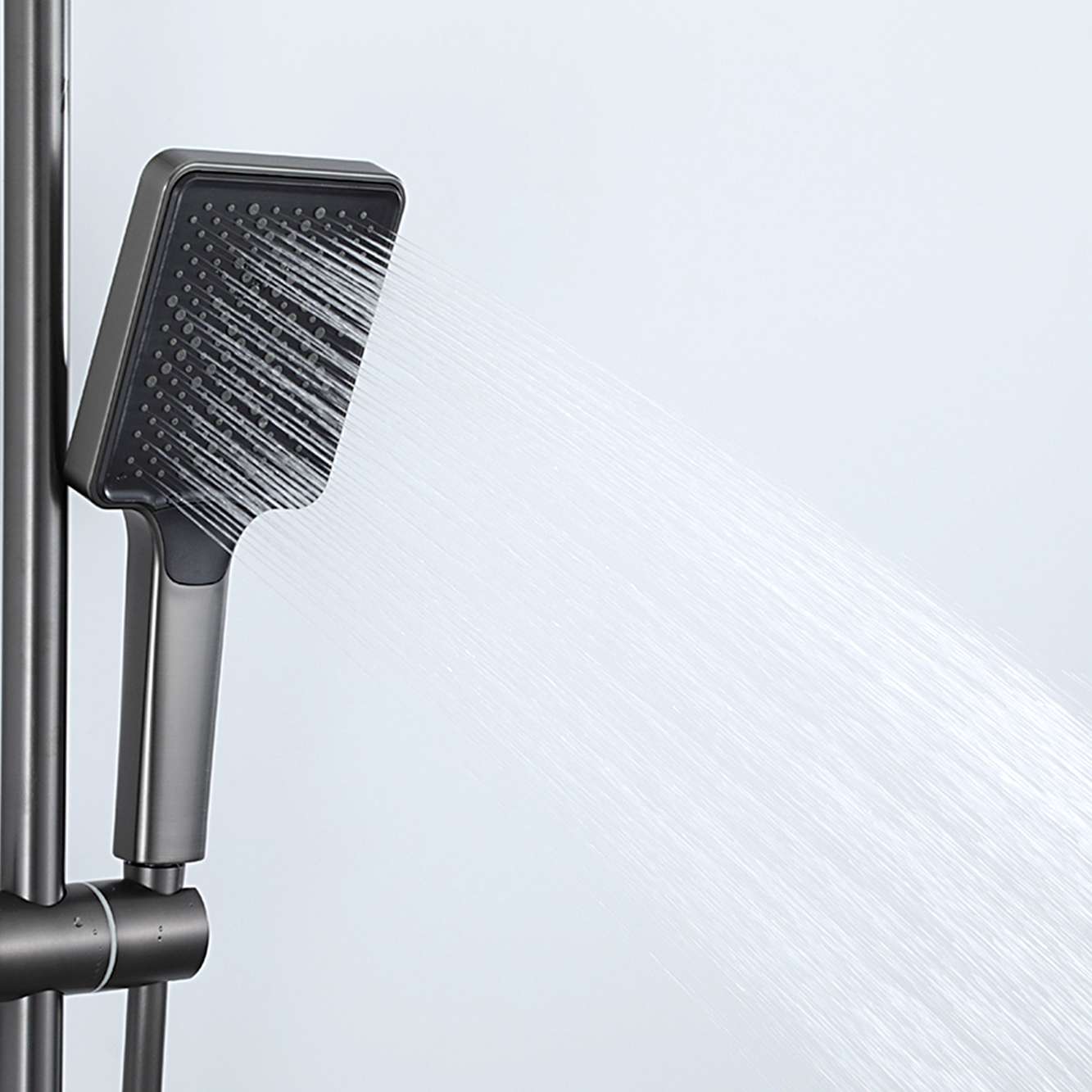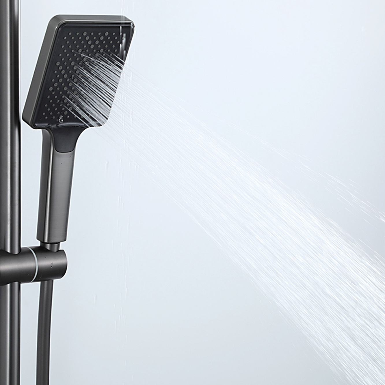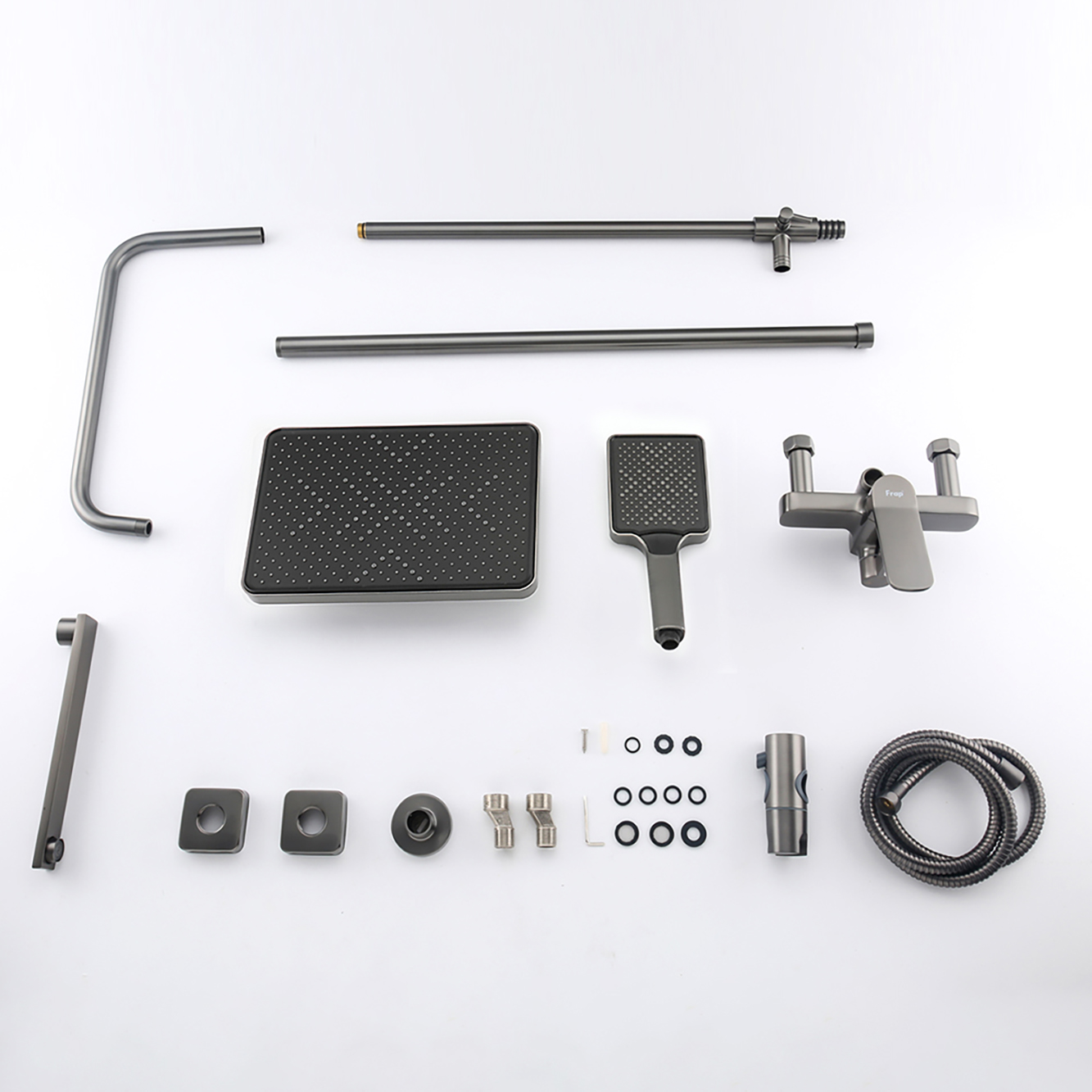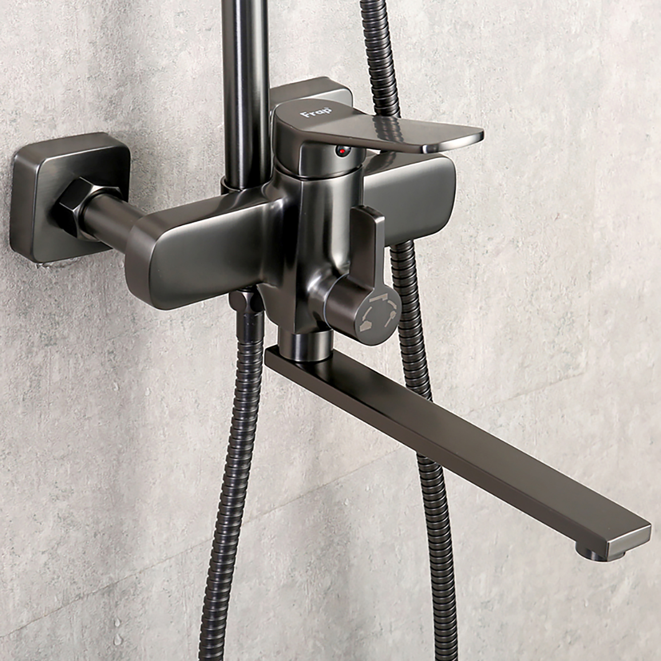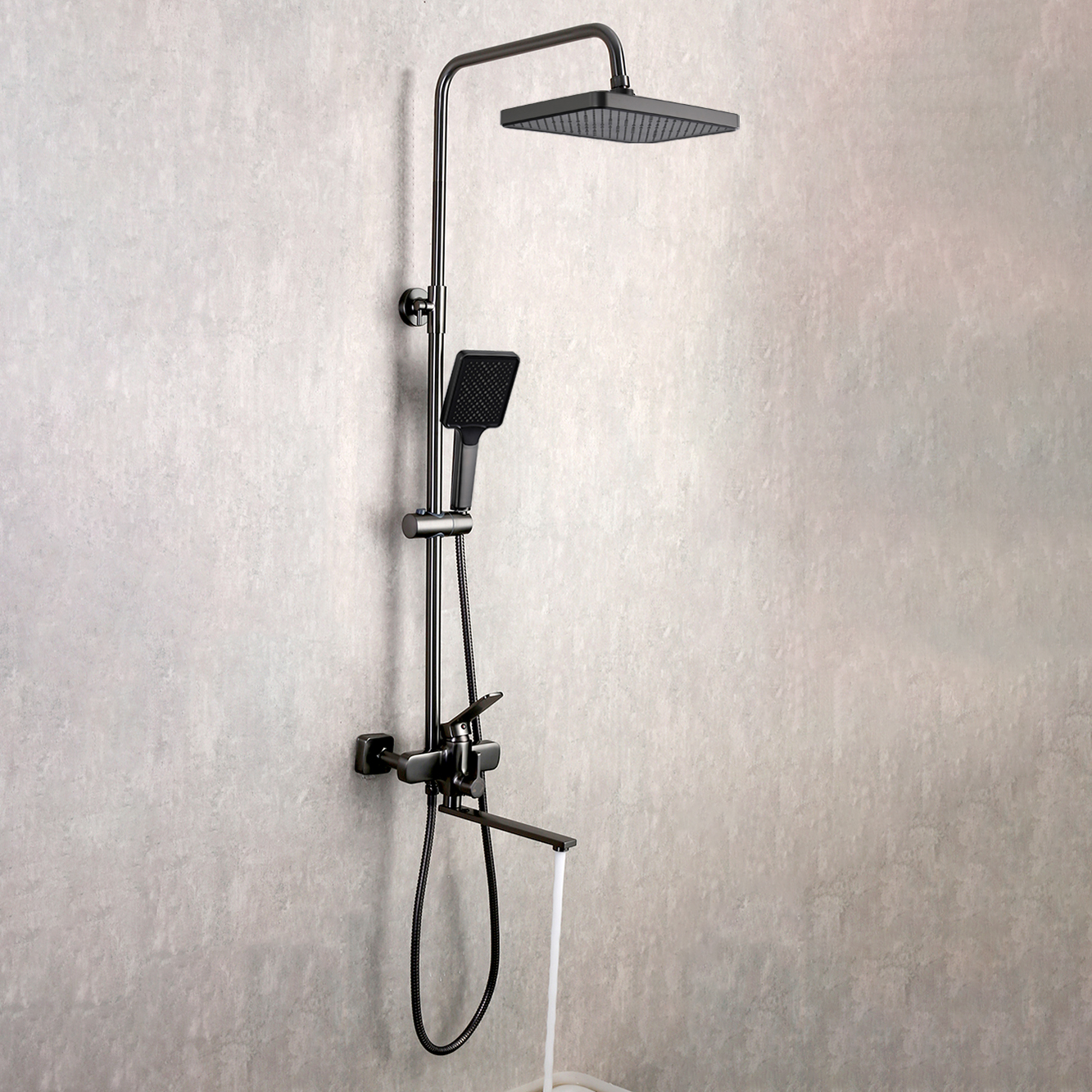 Комплектациясмеситель, душевая стойка, верхний душ, душевая лейка, душевой шланг, держатель для душевой лейки, настенный держатель, отражатели, эксцентрики