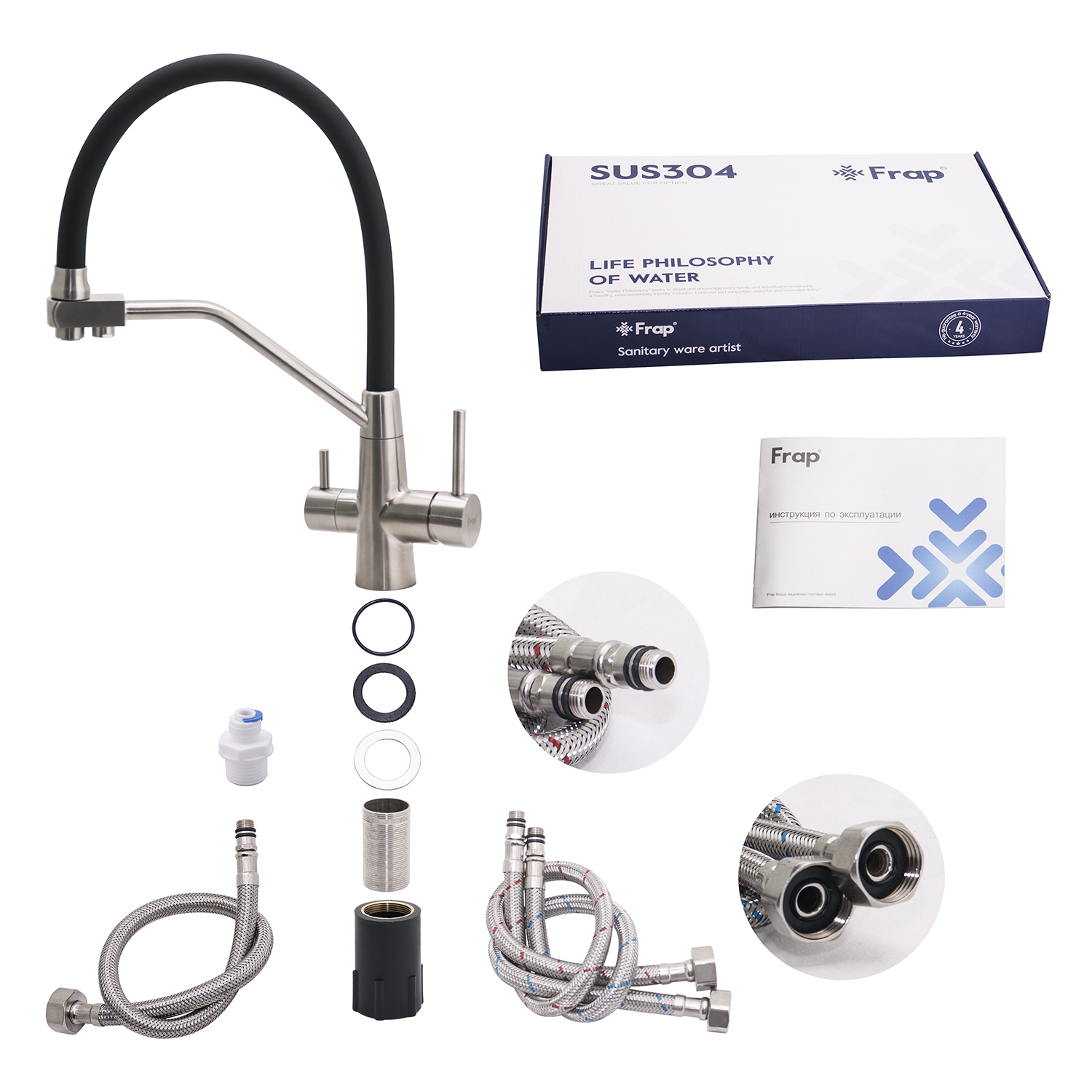 Комплектация товара Смеситель для кухни с гибким изливом Frap F4374-55 зависит от конкретной поставки и может меняться поставщиком без предварительного уведомления!
