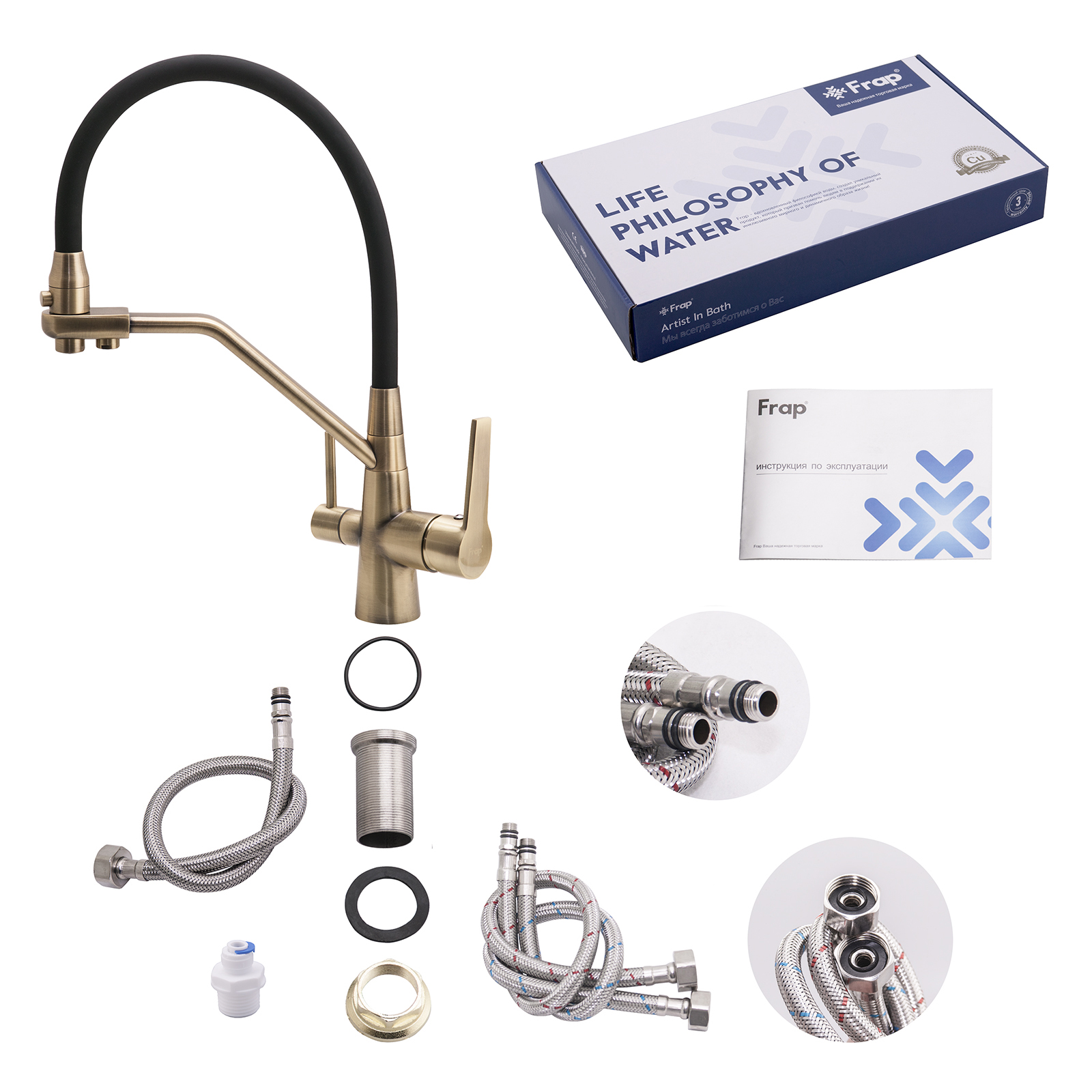 Комплектация товара Смеситель для кухни со встроенным фильтром (краном) под питьевую воду Frap F4374-4 зависит от конкретной поставки и может меняться поставщиком без предварительного уведомления!