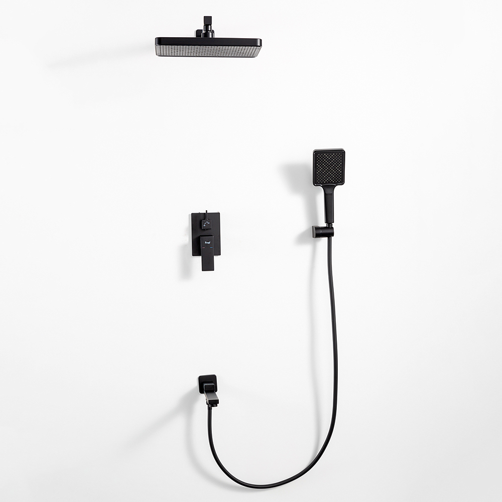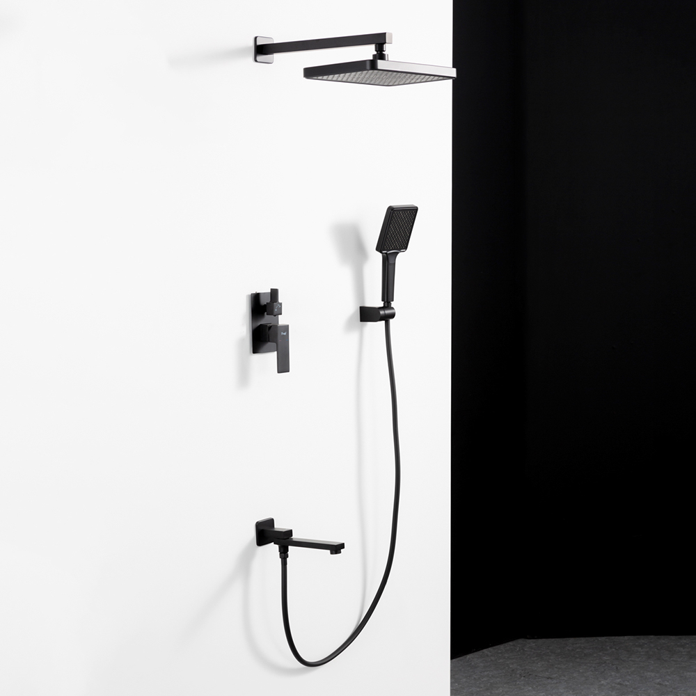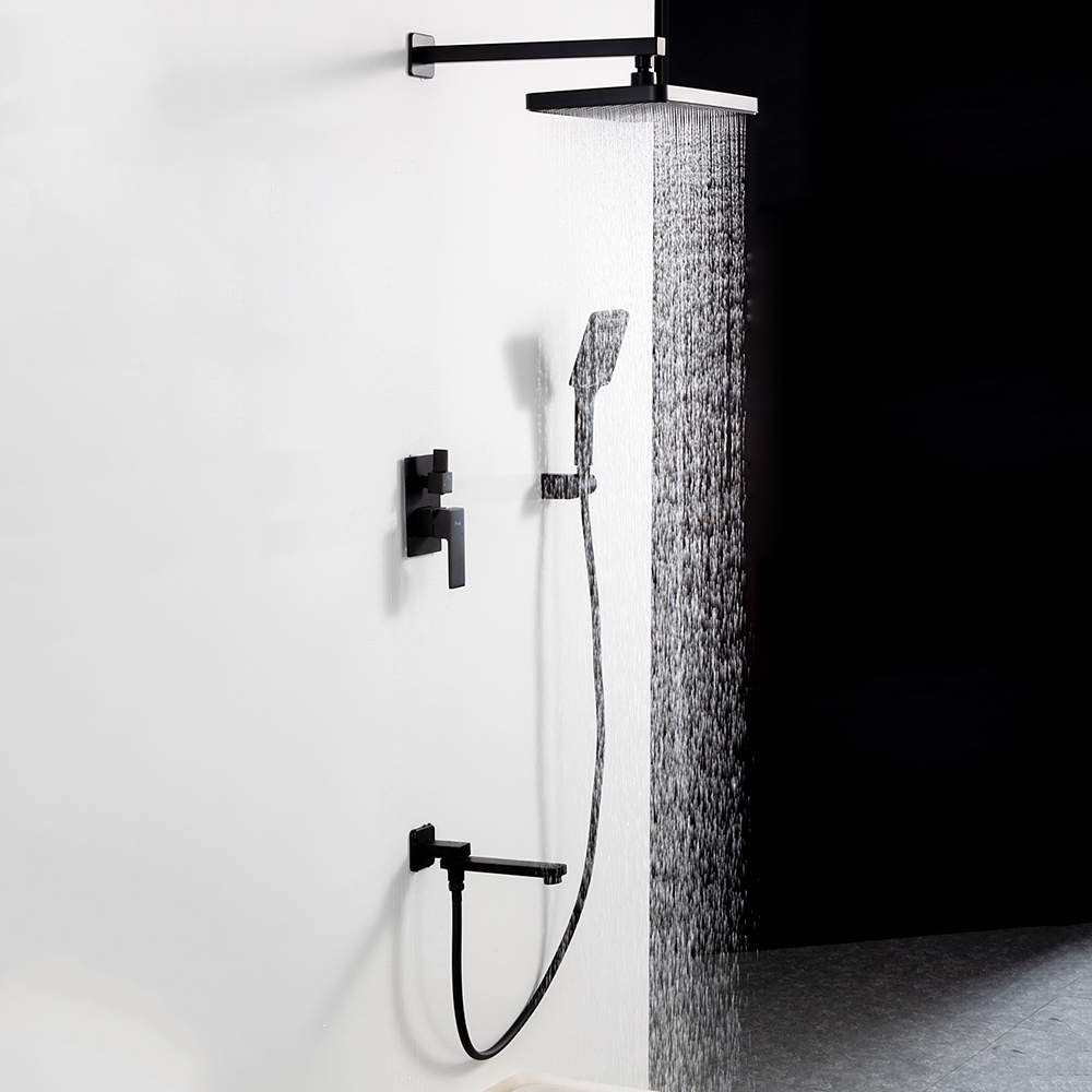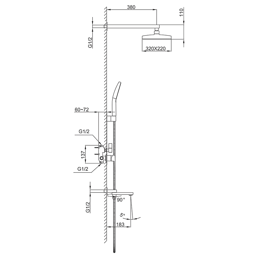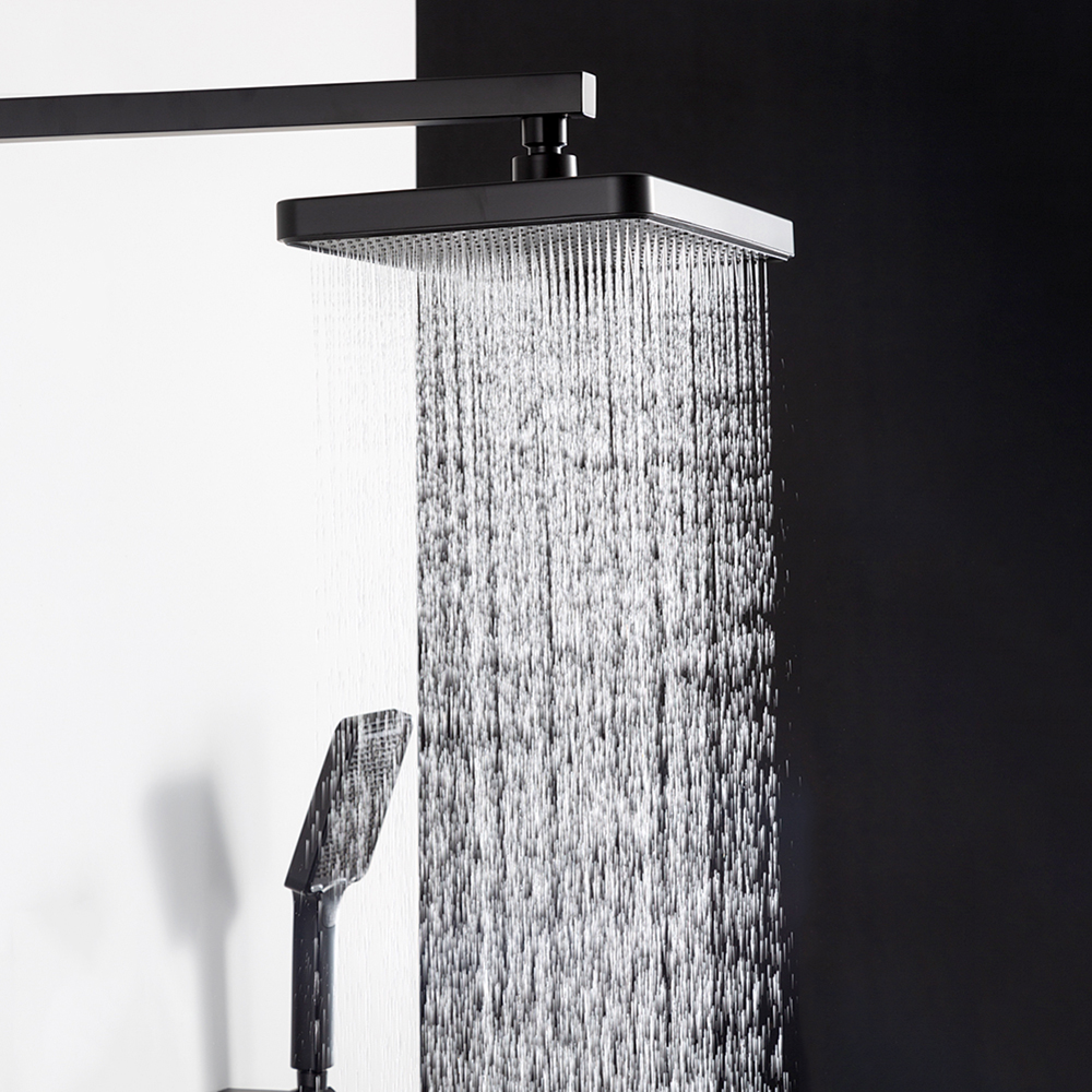 Комплектацияверхний душ, держатель для душевой лейки, душевая лейка, душевой шланг, излив, кронштейн, наружная часть смесителя, смеситель