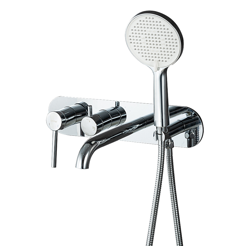 Комплектацияверхний душ, держатель для душевой лейки, душевая лейка, душевой шланг, излив, кронштейн, наружная часть смесителя, смеситель