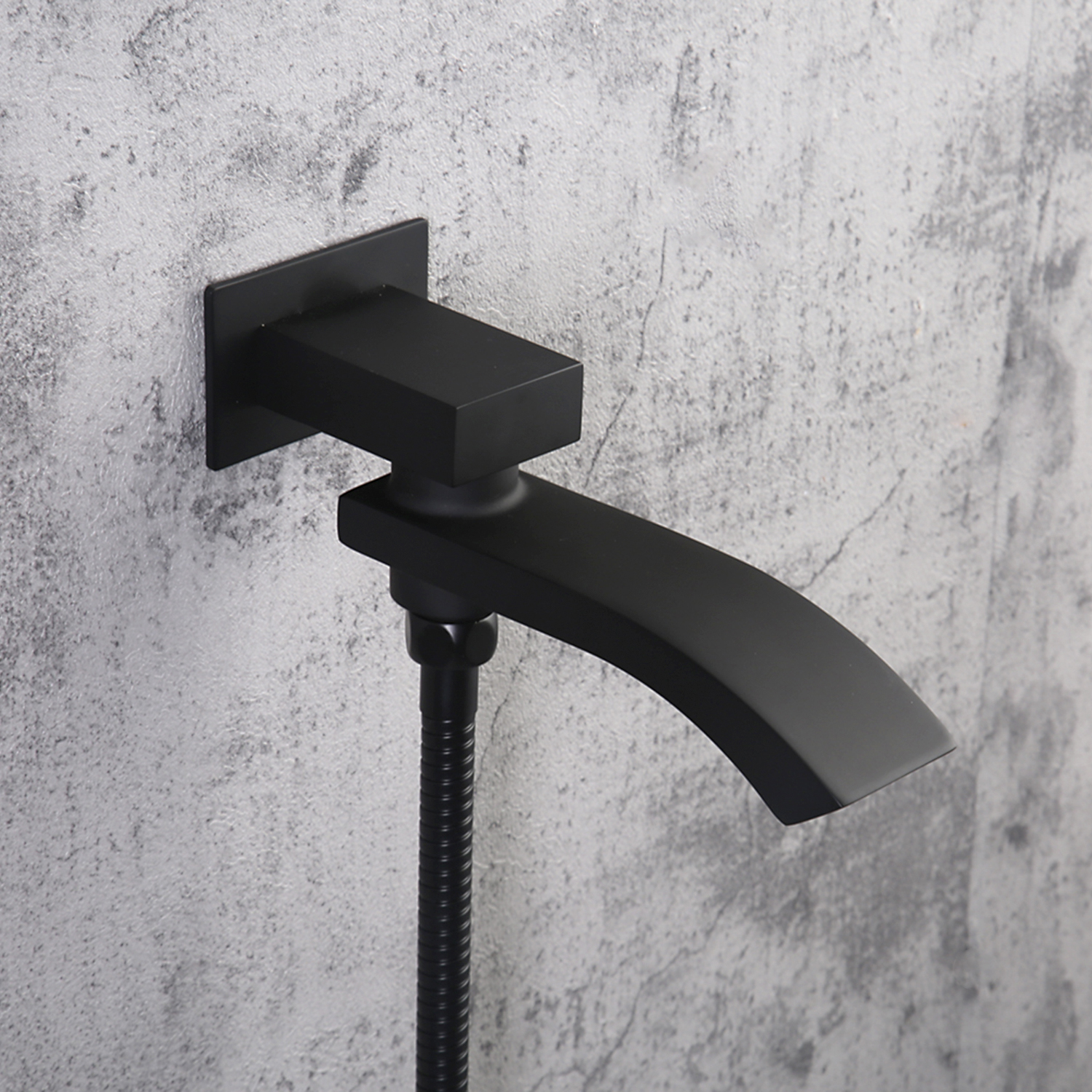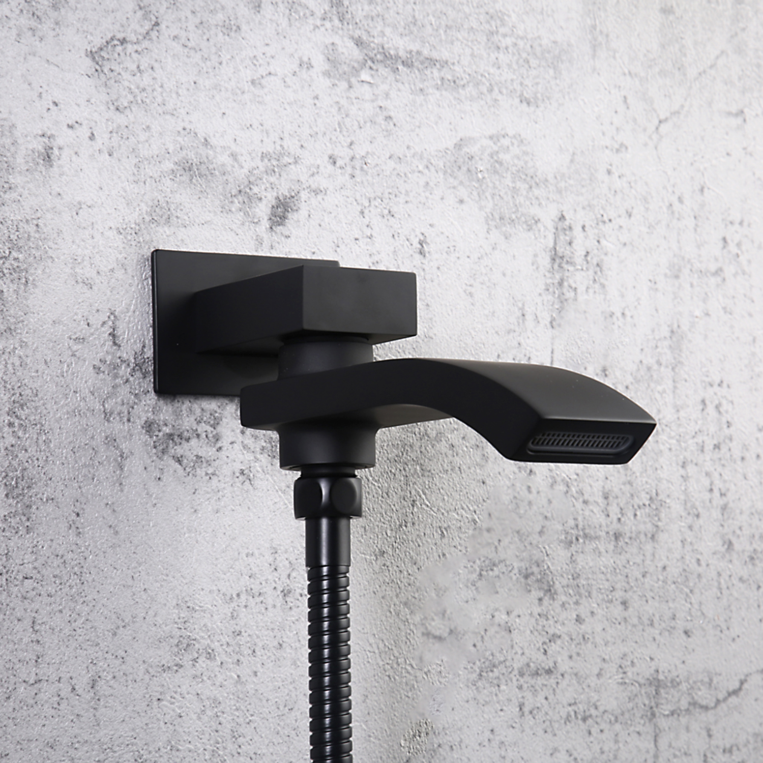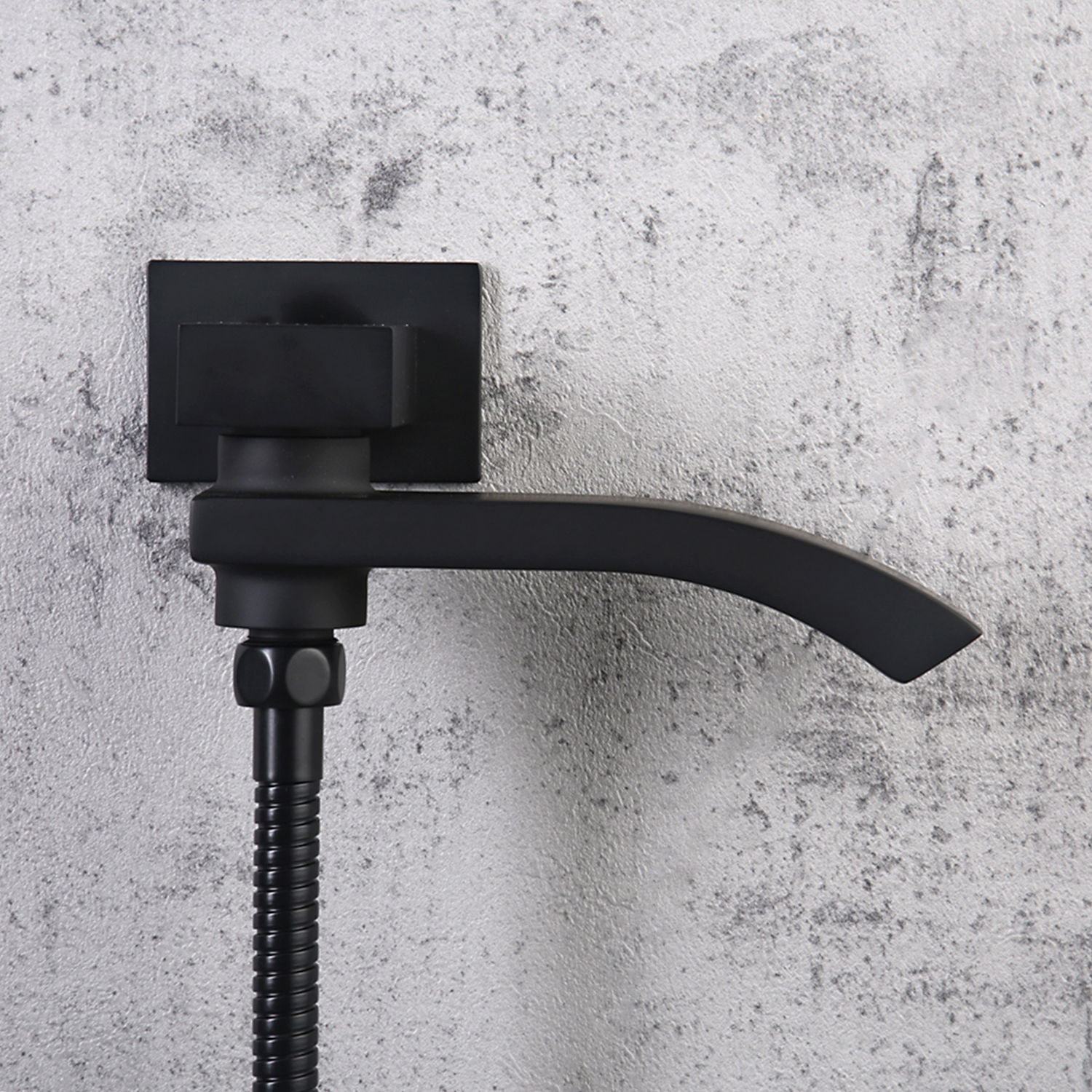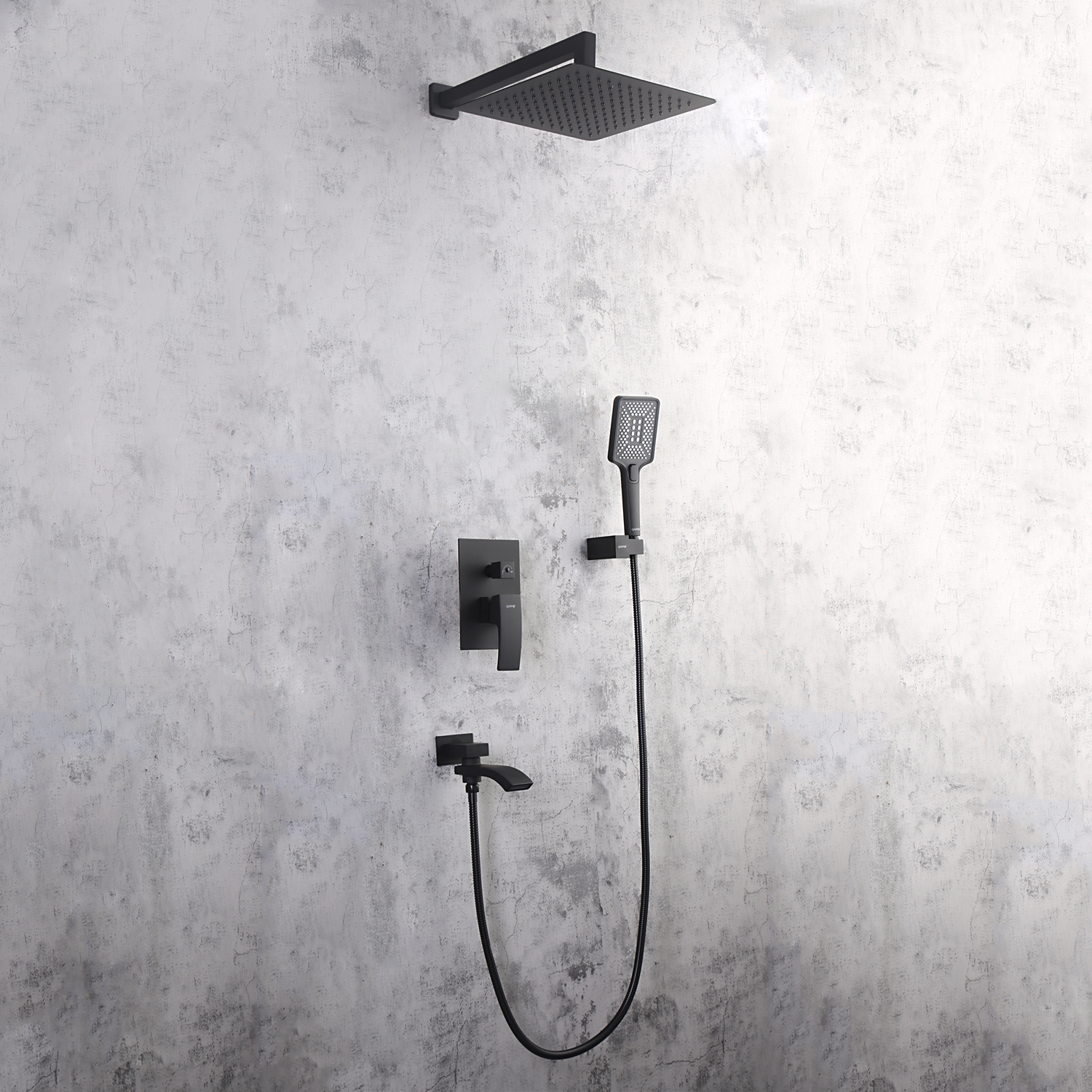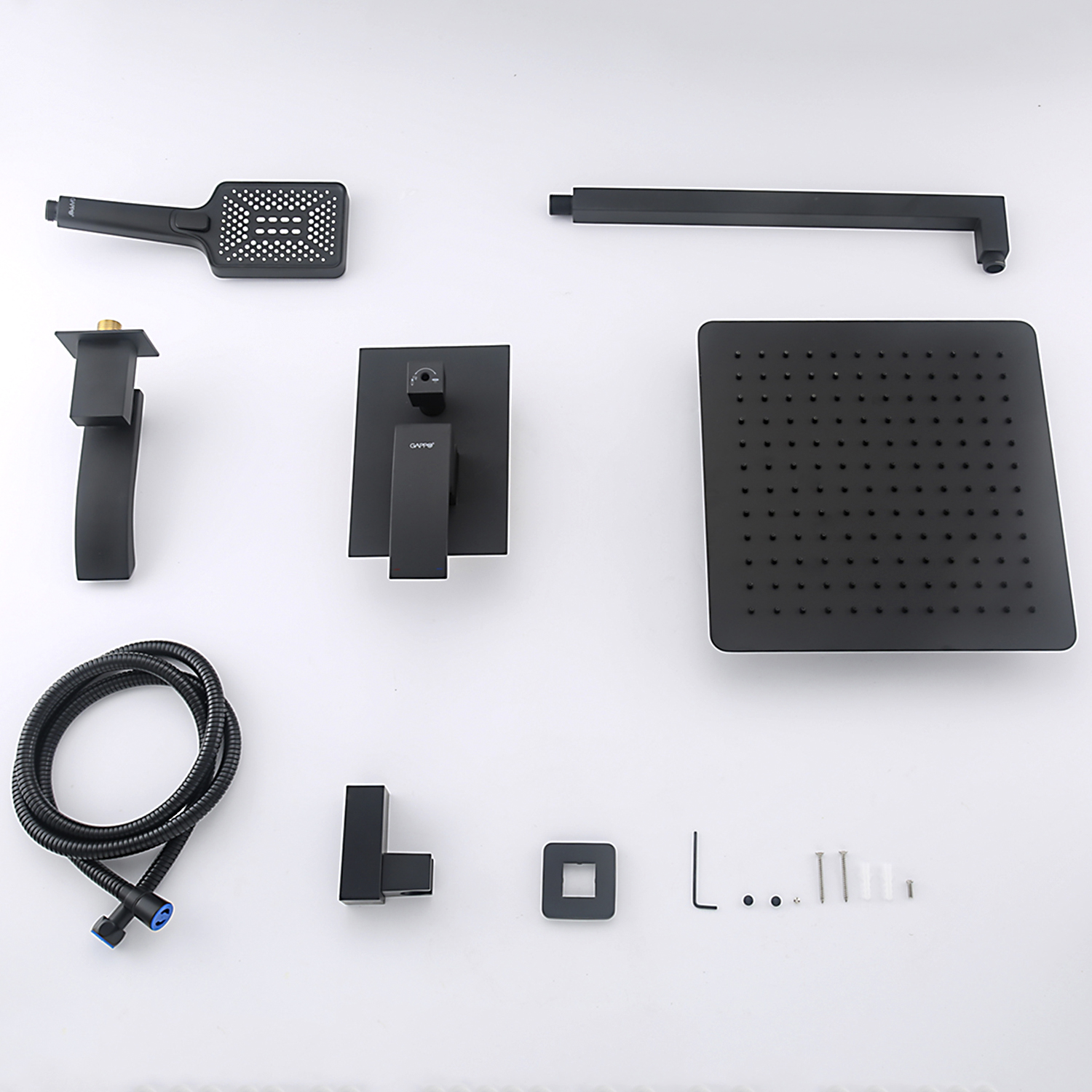 Комплектацияверхний душ, держатель для душевой лейки, душевая лейка, душевой шланг, излив, наружная часть смесителя, смеситель