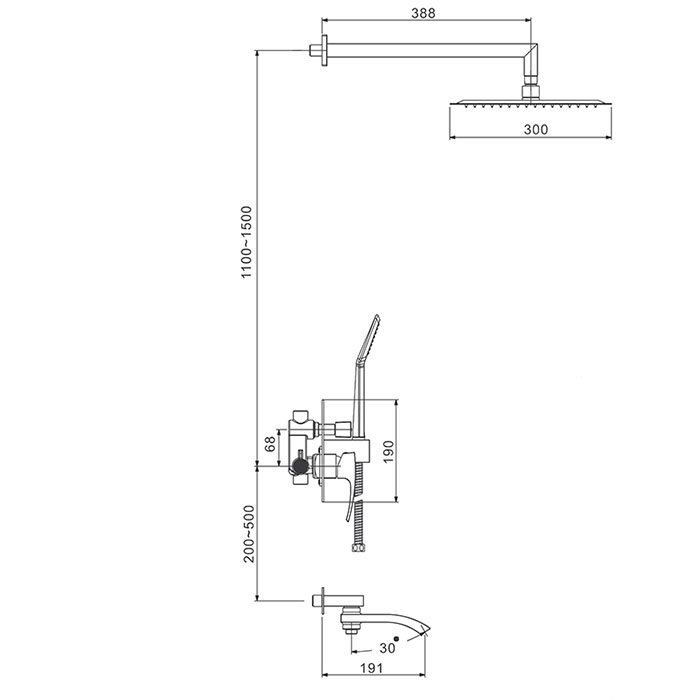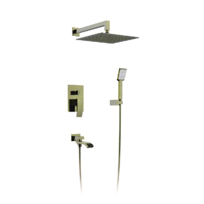 Комплектацияверхний душ, держатель для душевой лейки, душевая лейка, душевой шланг, излив, кронштейн, наружная часть смесителя, смеситель