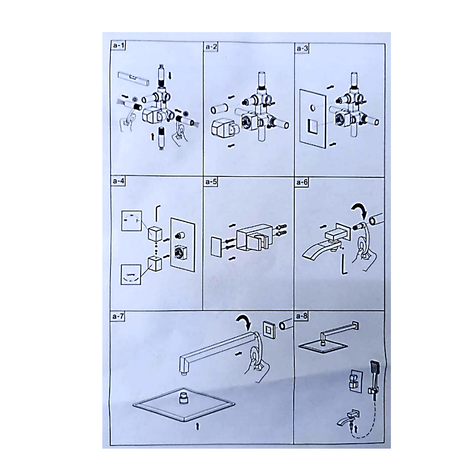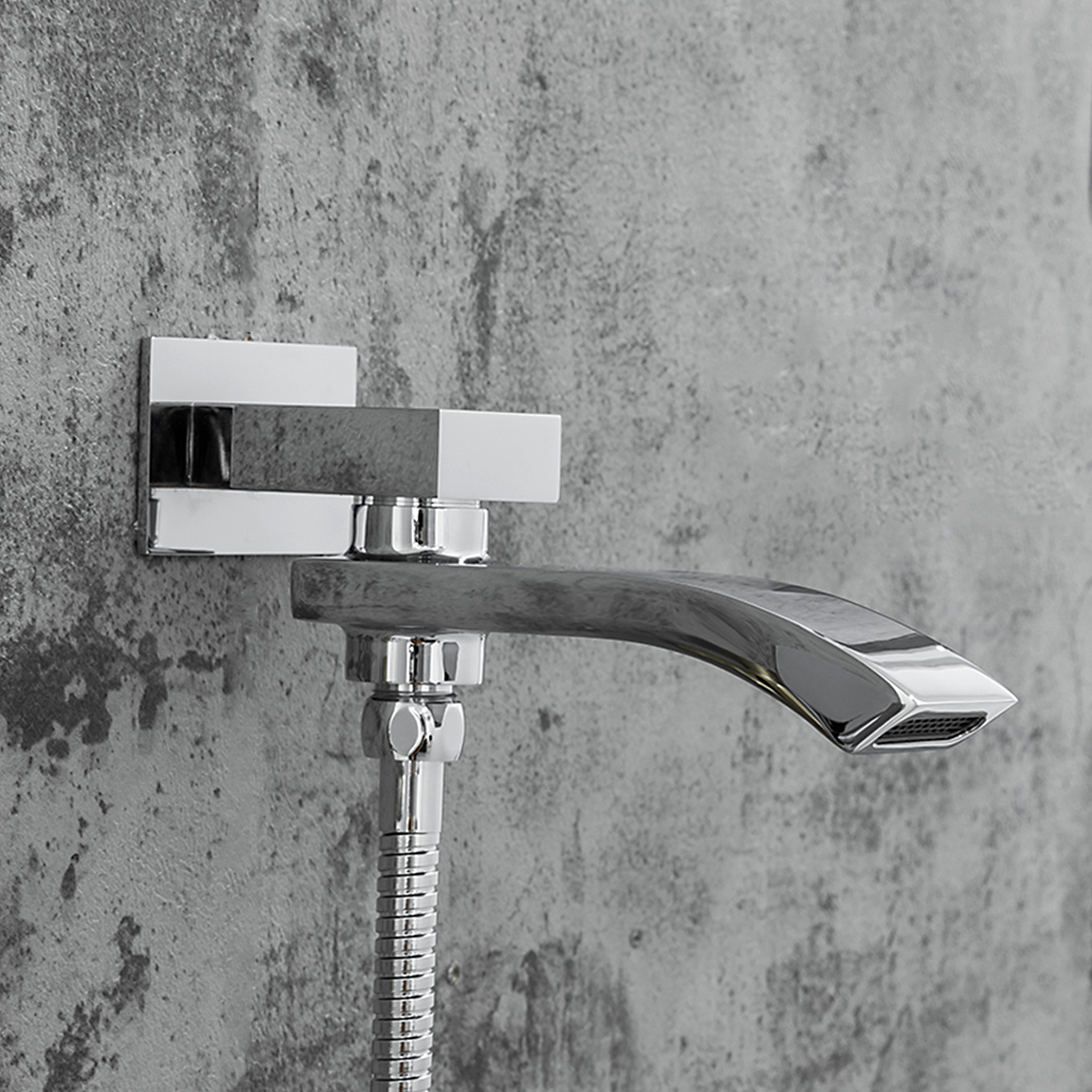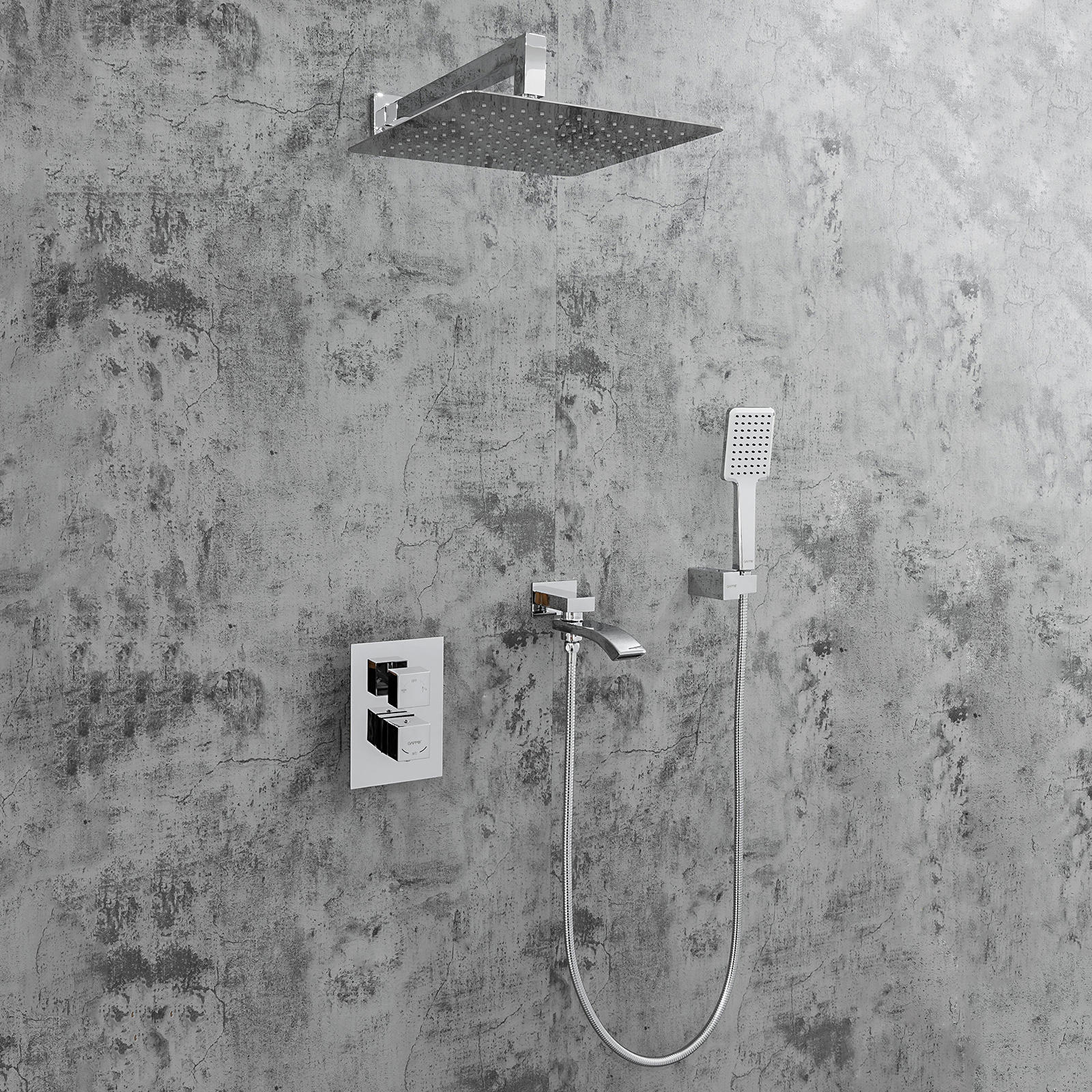 Комплектацияверхний душ, держатель для душевой лейки, душевая лейка, душевой шланг, излив, кронштейн, наружная часть смесителя, смеситель