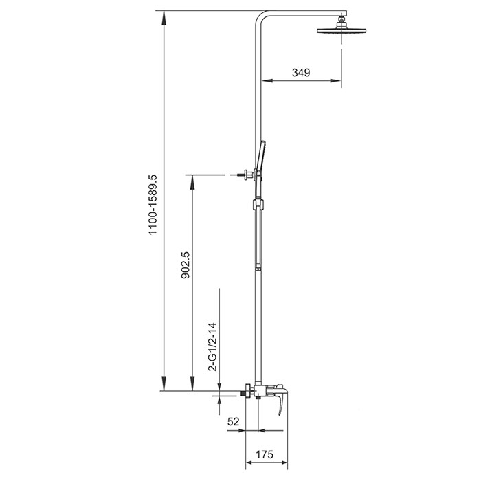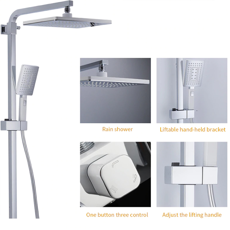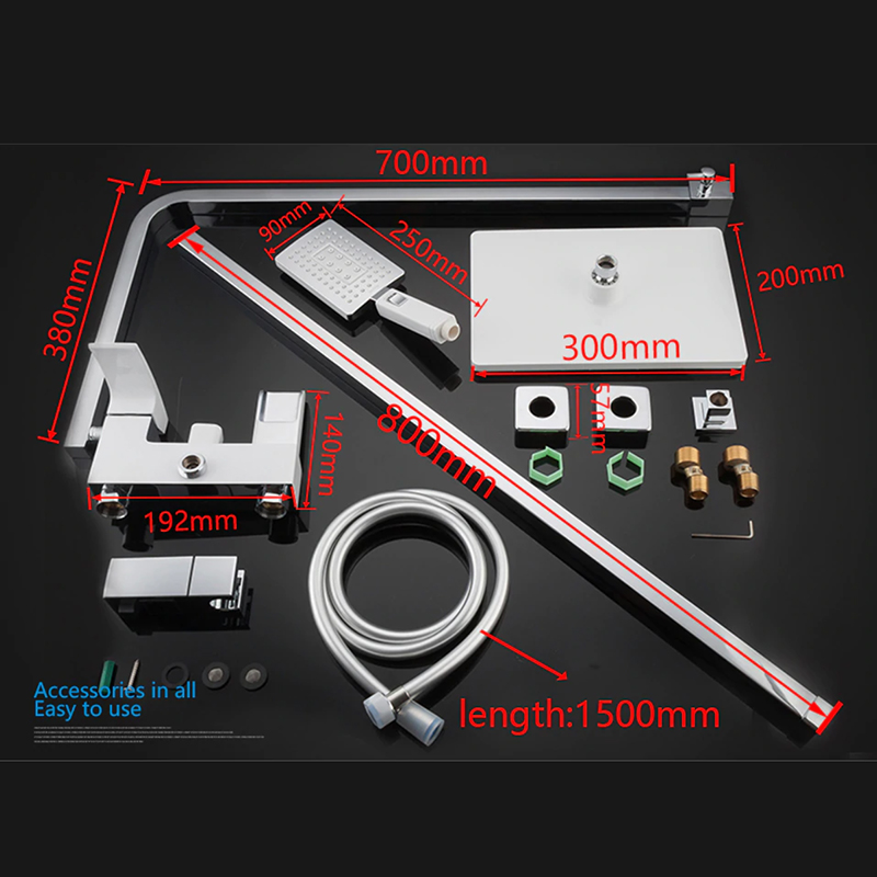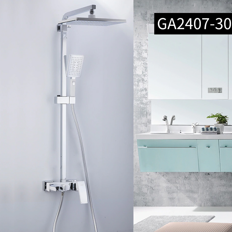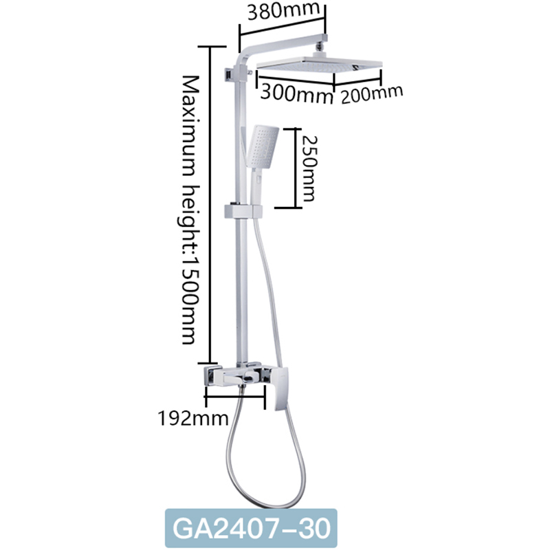 Комплектациясмеситель, душевая стойка, верхний душ, душевая лейка, душевой шланг, держатель для душевой лейки, настенный держатель, отражатели