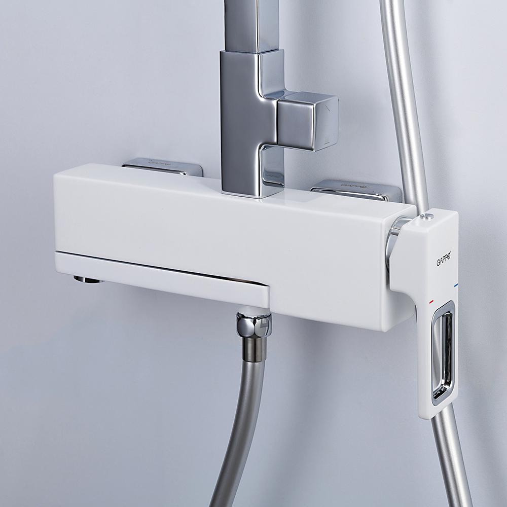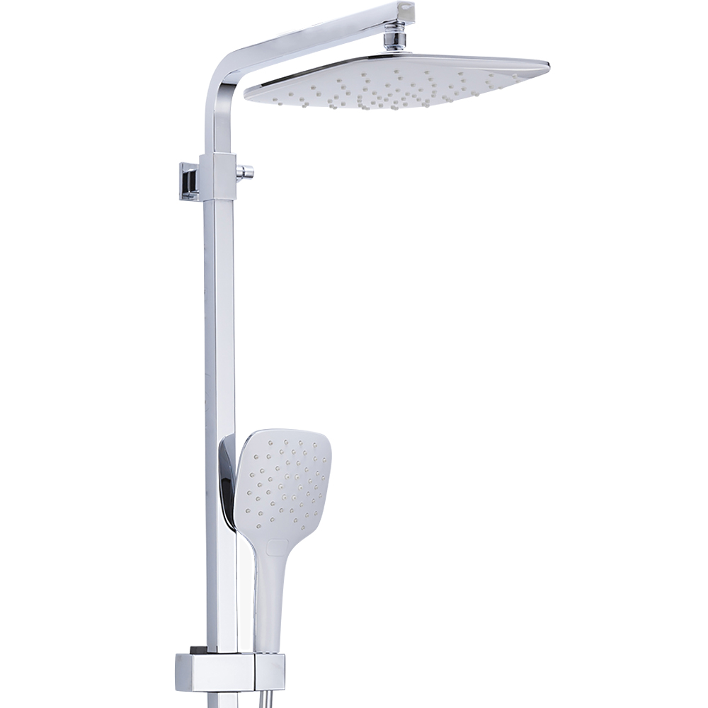 Комплектациясмеситель, душевая стойка, верхний душ, душевая лейка, душевой шланг, держатель для душевой лейки, настенный держатель, отражатели, эксцентрики