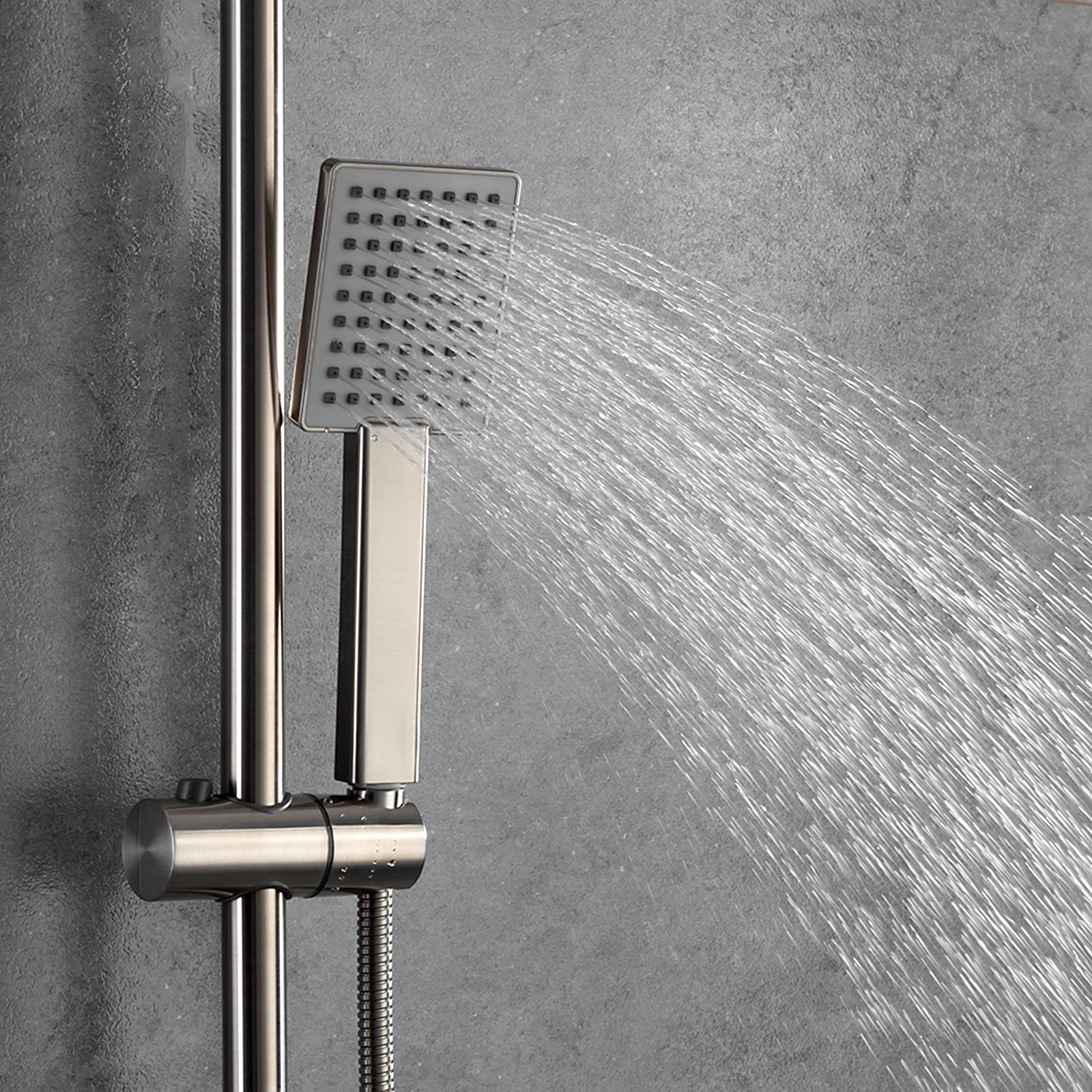 Комплектациясмеситель, душевая стойка, верхний душ, душевая лейка, душевой шланг, держатель для душевой лейки, настенный держатель, отражатели, эксцентрики