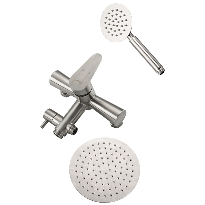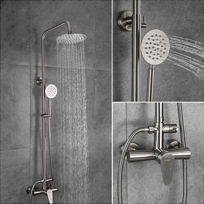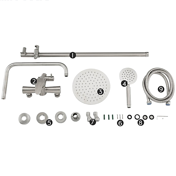 Комплектациясмеситель, душевая стойка, верхний душ, душевая лейка, душевой шланг, держатель для душевой лейки, настенный держатель, отражатели, эксцентрики