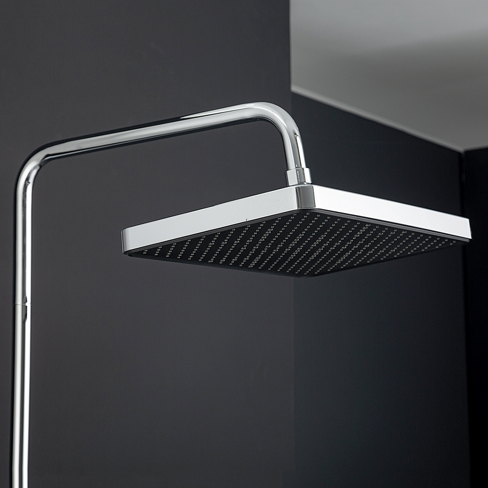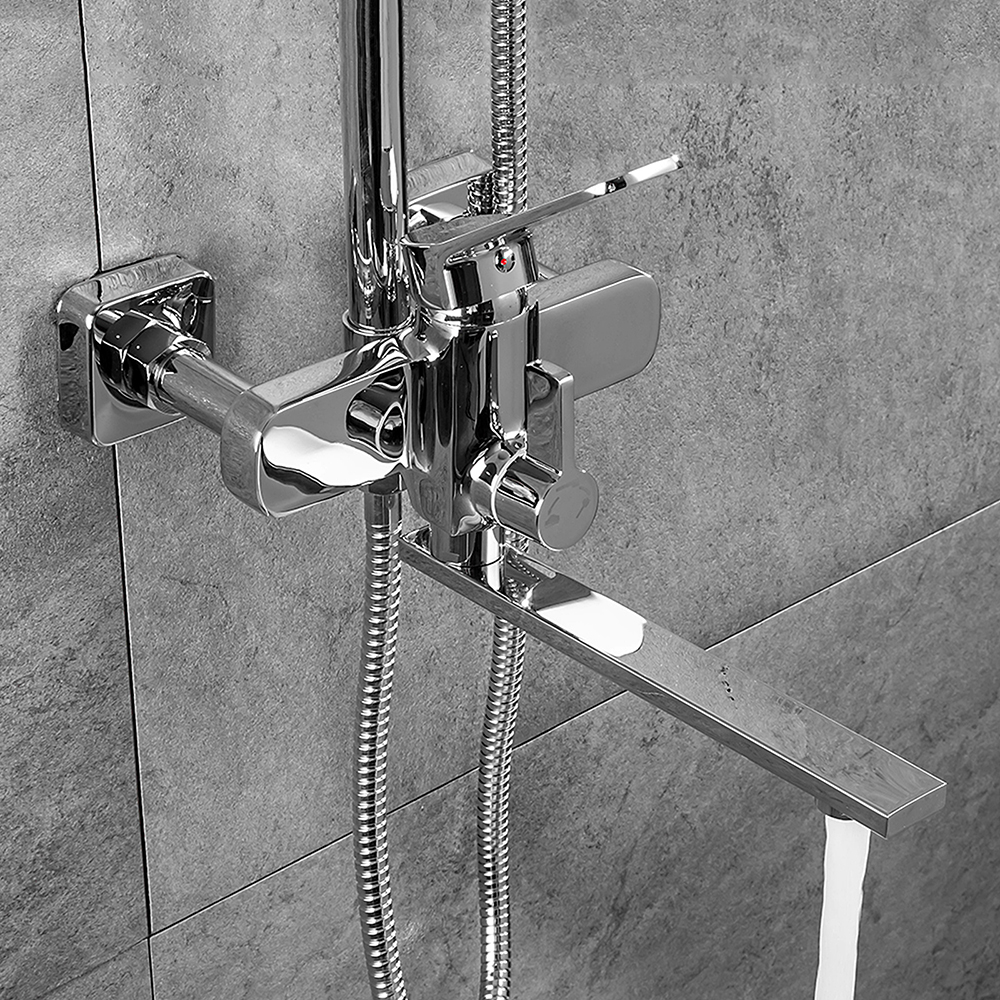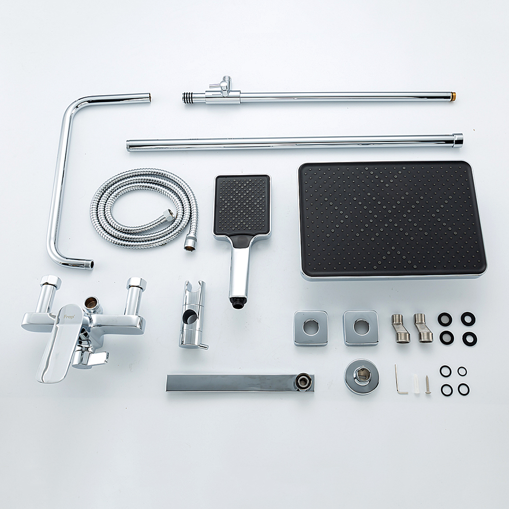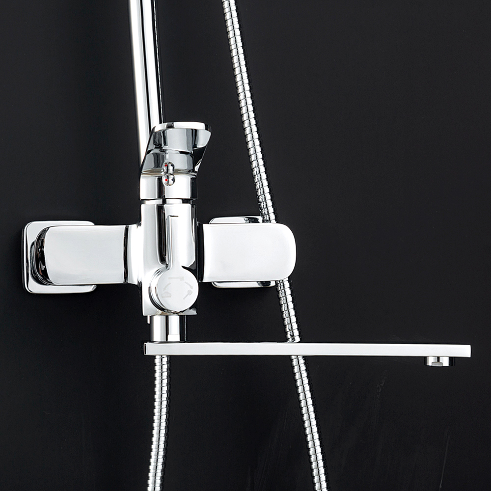 Комплектациясмеситель, душевая стойка, верхний душ, душевая лейка, душевой шланг, держатель для душевой лейки, настенный держатель, отражатели, эксцентрики