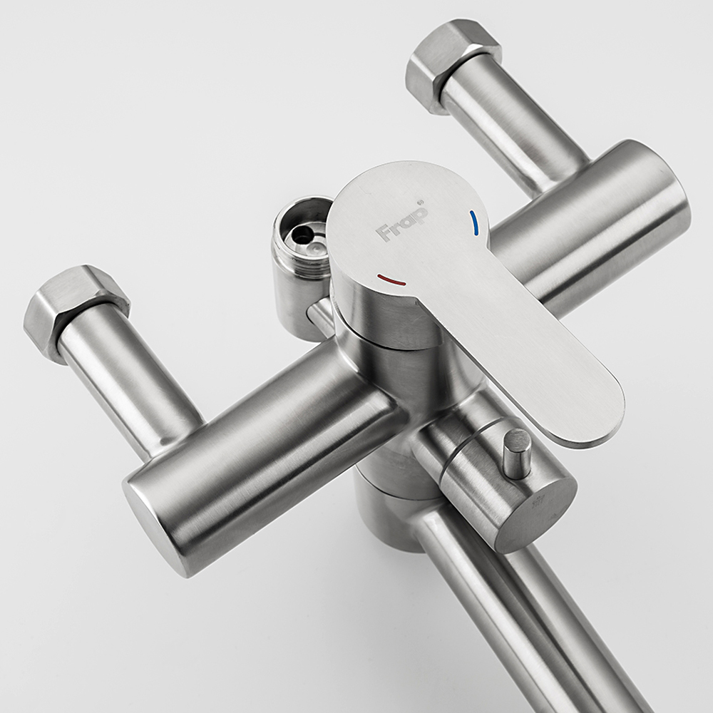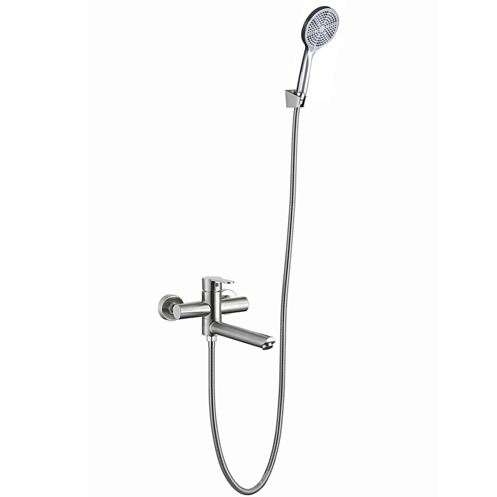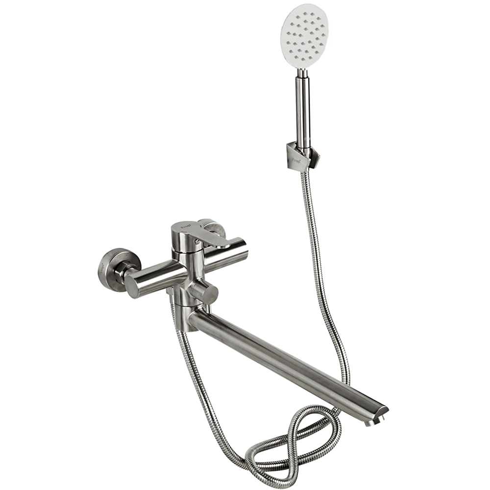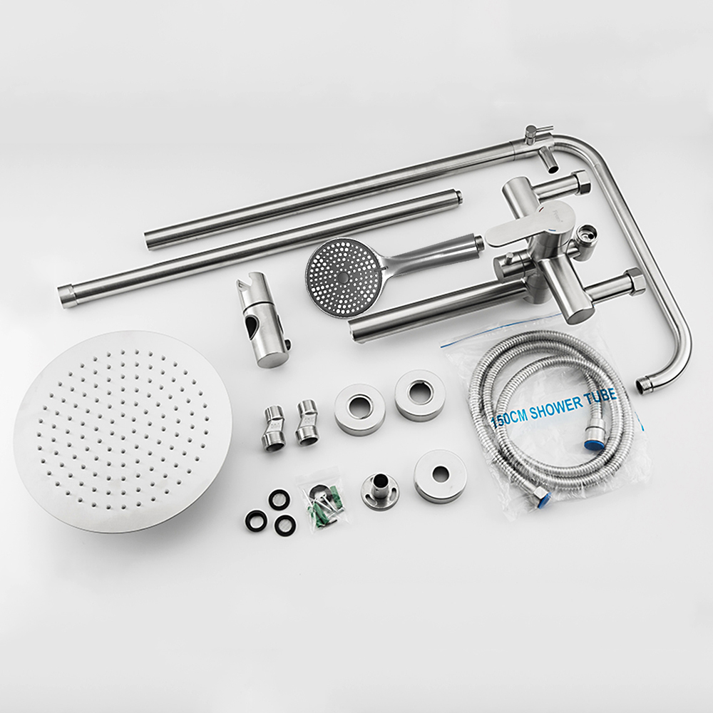 Комплектациясмеситель, душевая стойка, верхний душ, душевая лейка, душевой шланг, держатель для душевой лейки, настенный держатель, отражатели, эксцентрики