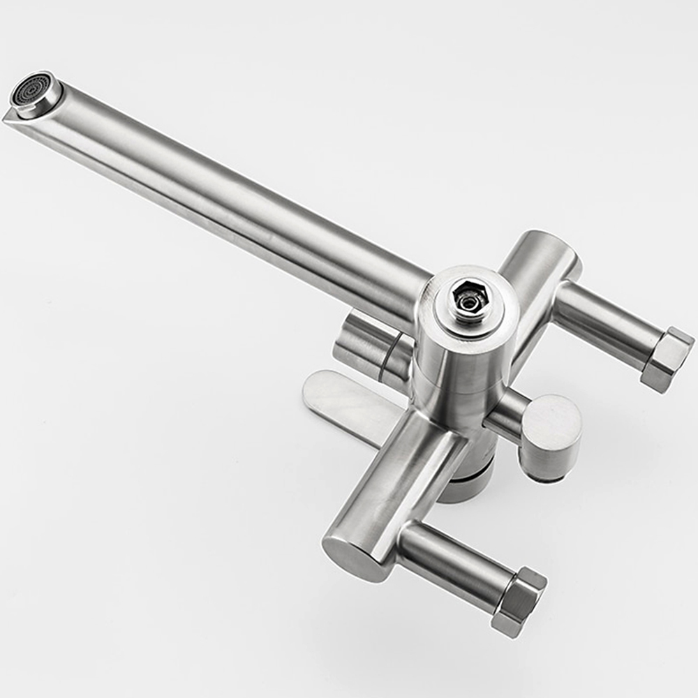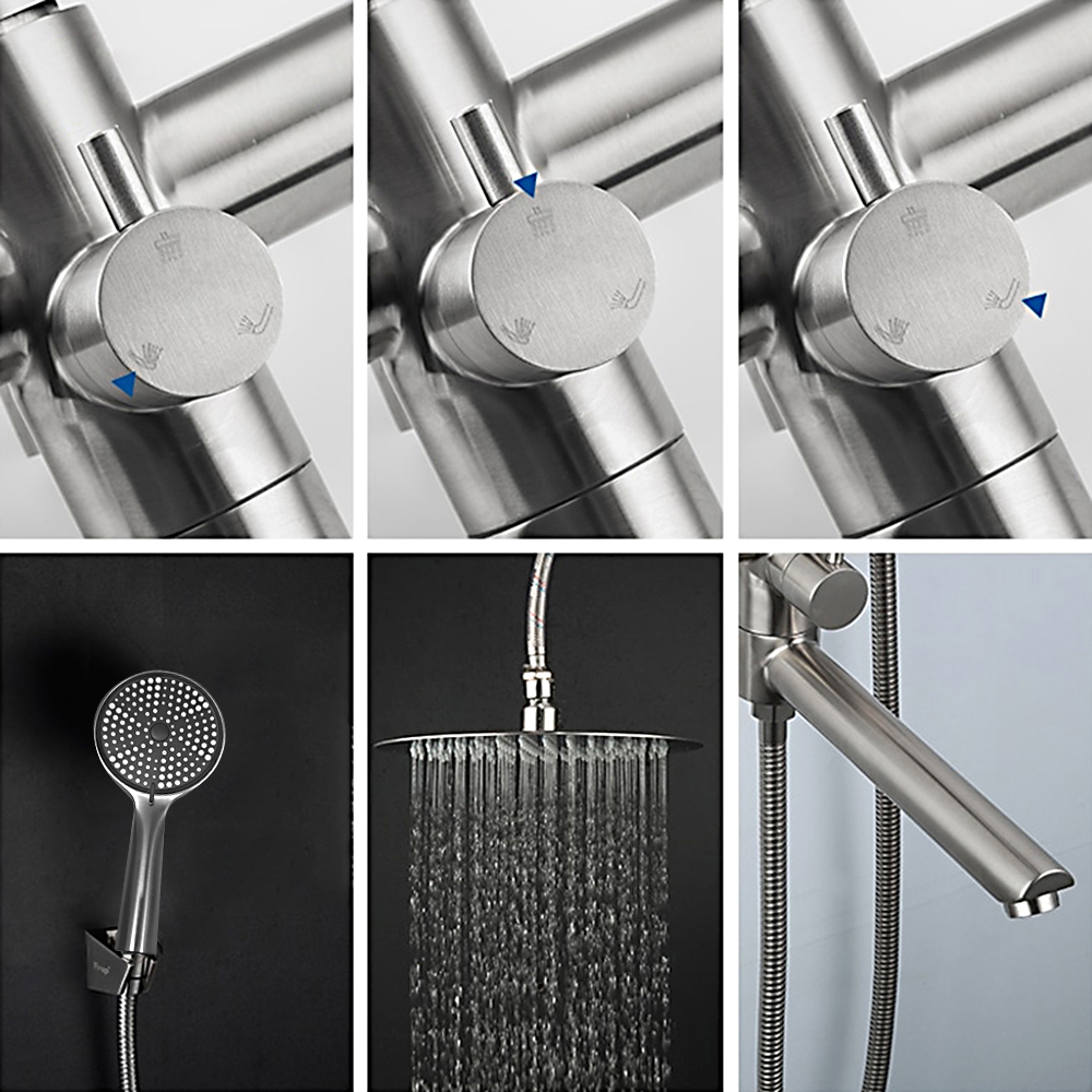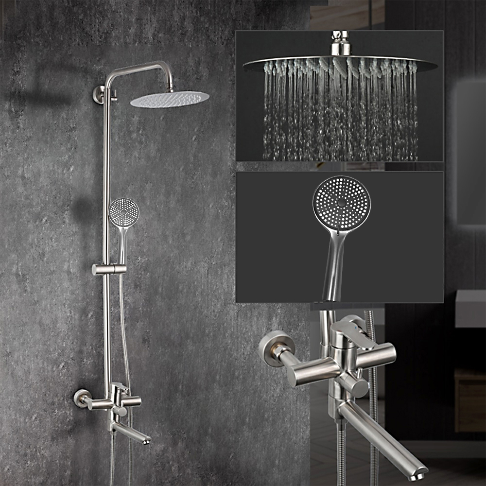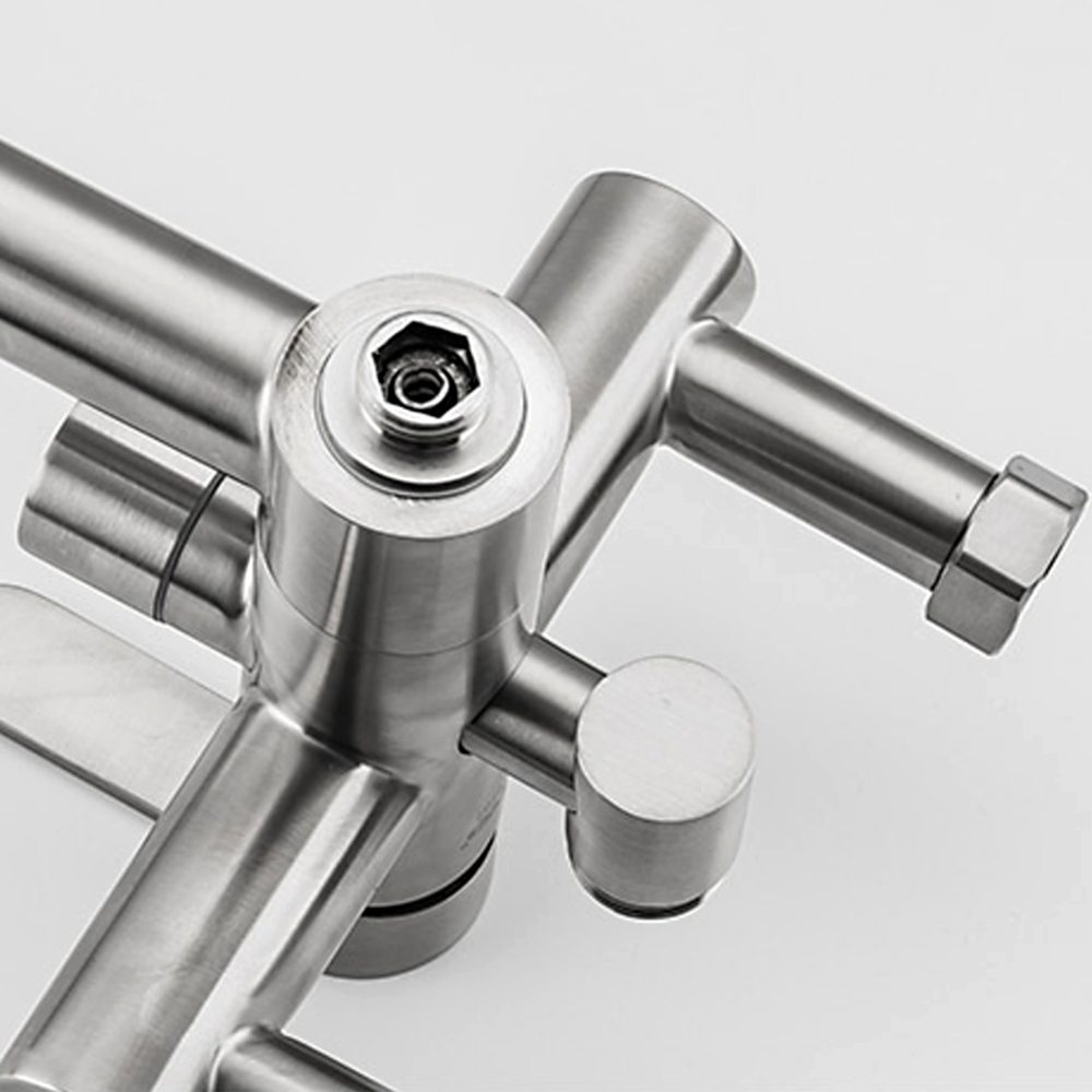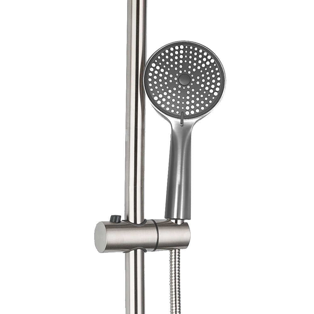 Комплектациясмеситель, душевая стойка, верхний душ, душевая лейка, душевой шланг, держатель для душевой лейки, настенный держатель, отражатели, эксцентрики