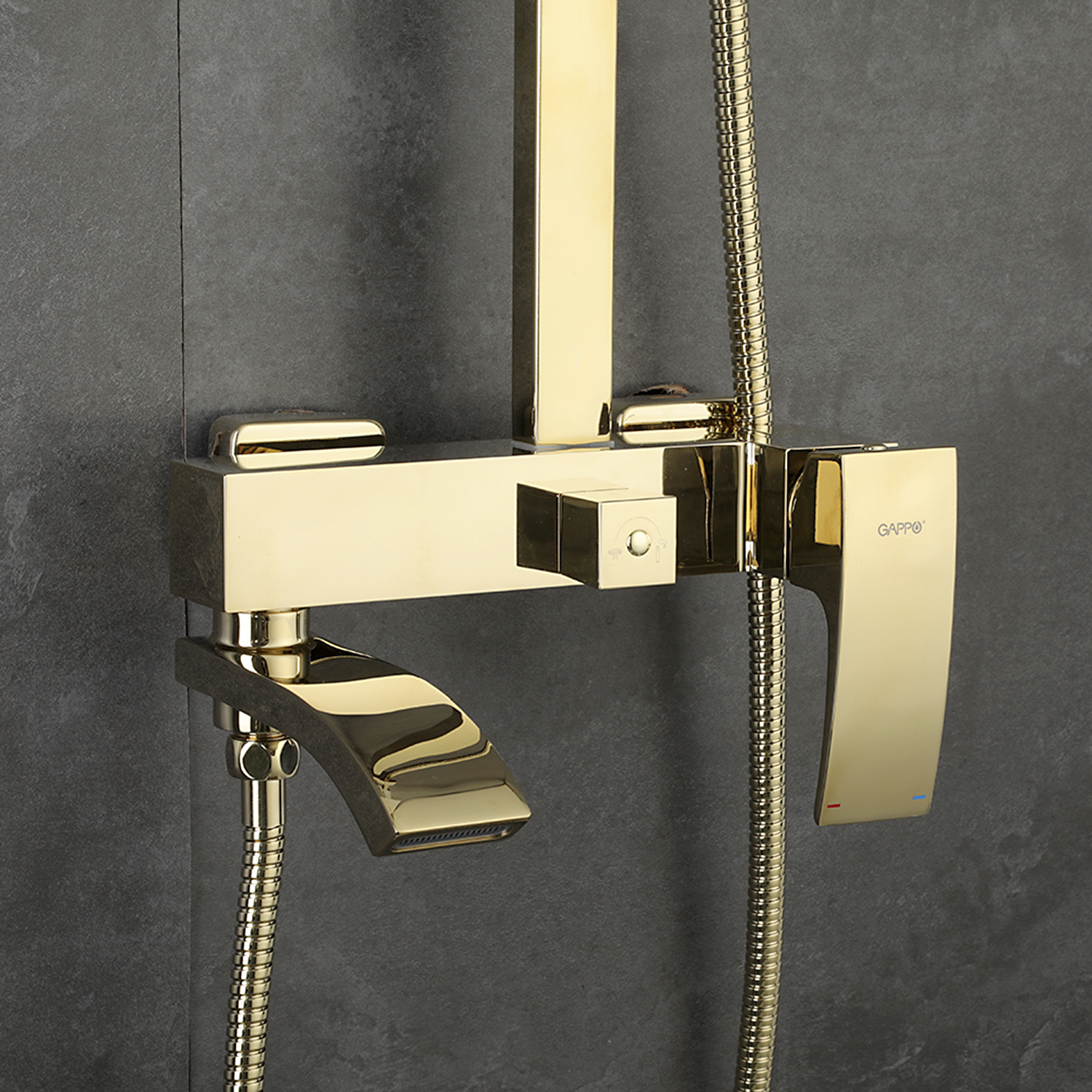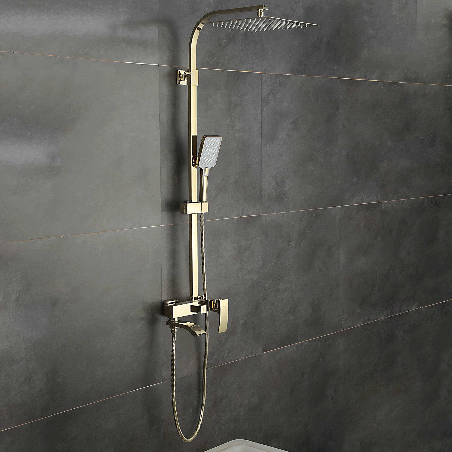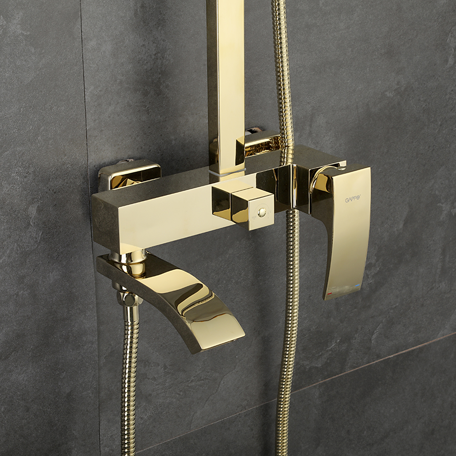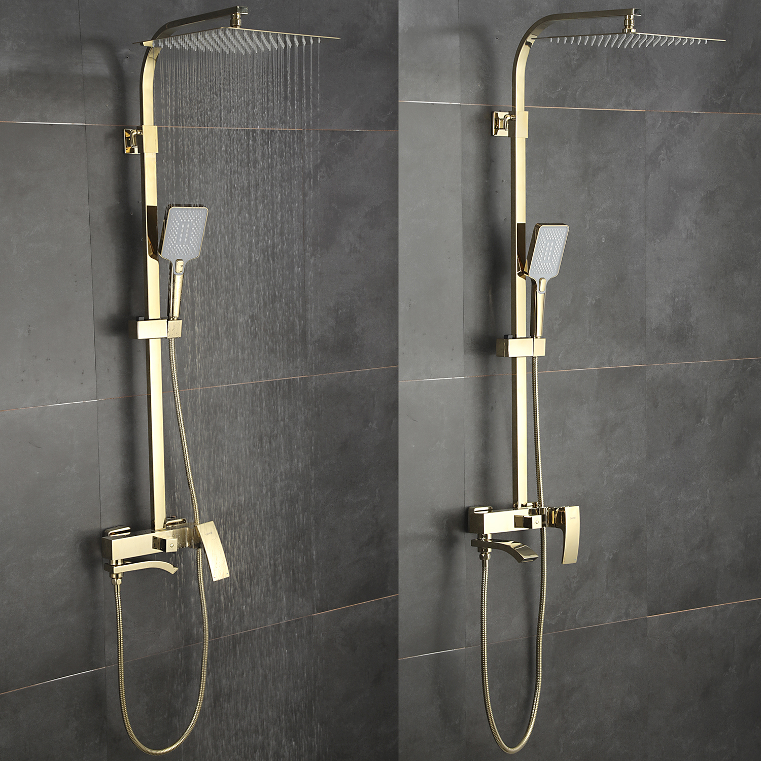 Комплектациясмеситель, душевая стойка, верхний душ, душевая лейка, душевой шланг, держатель для душевой лейки, настенный держатель, отражатели, эксцентрики
