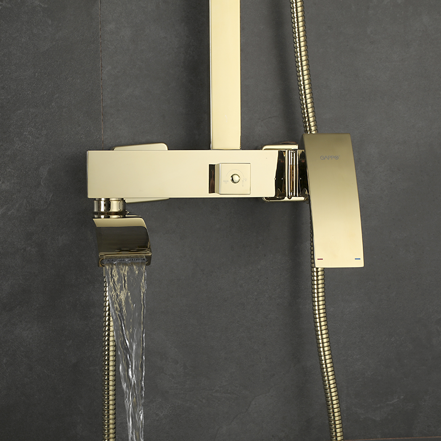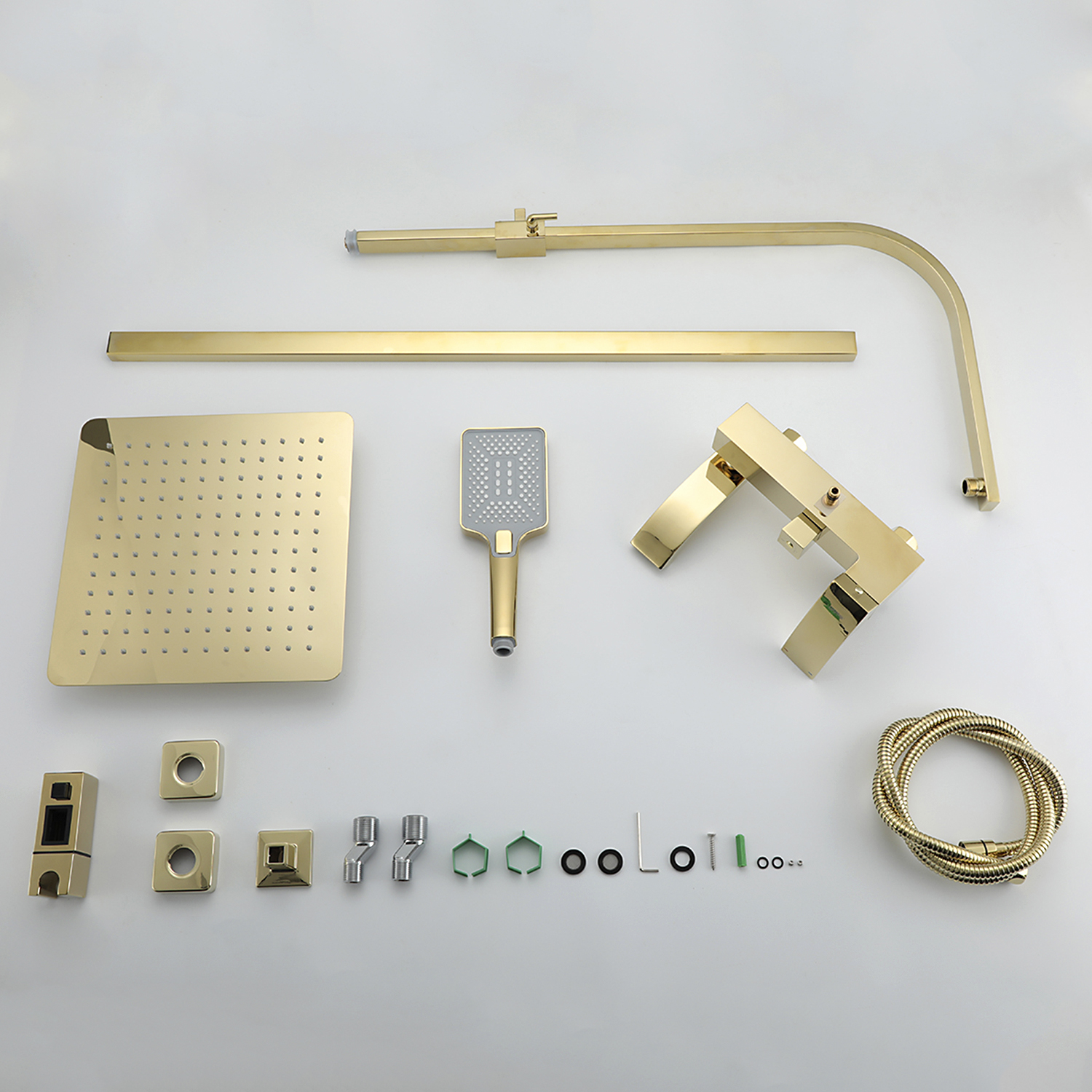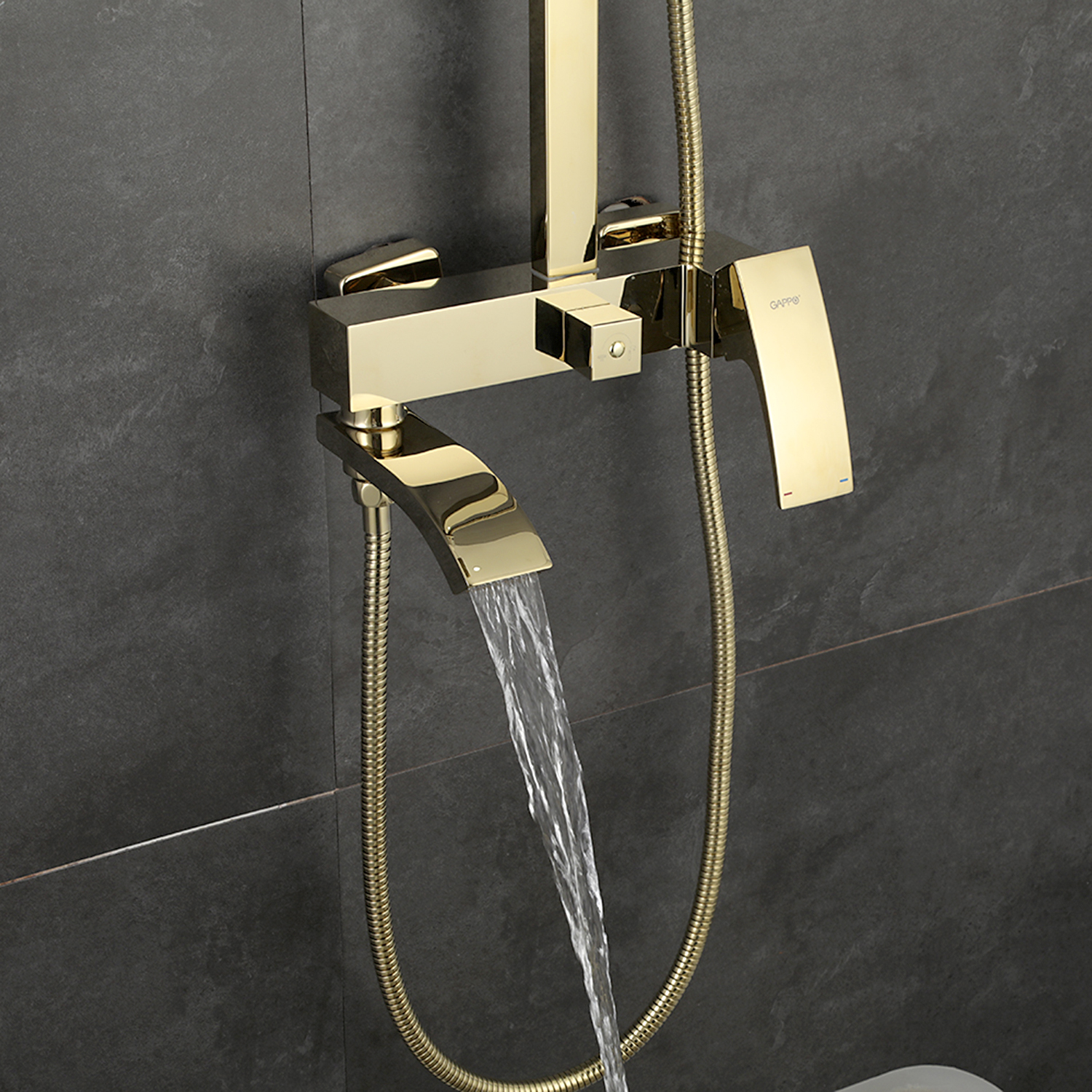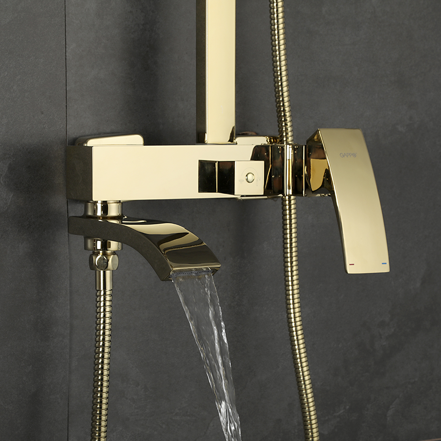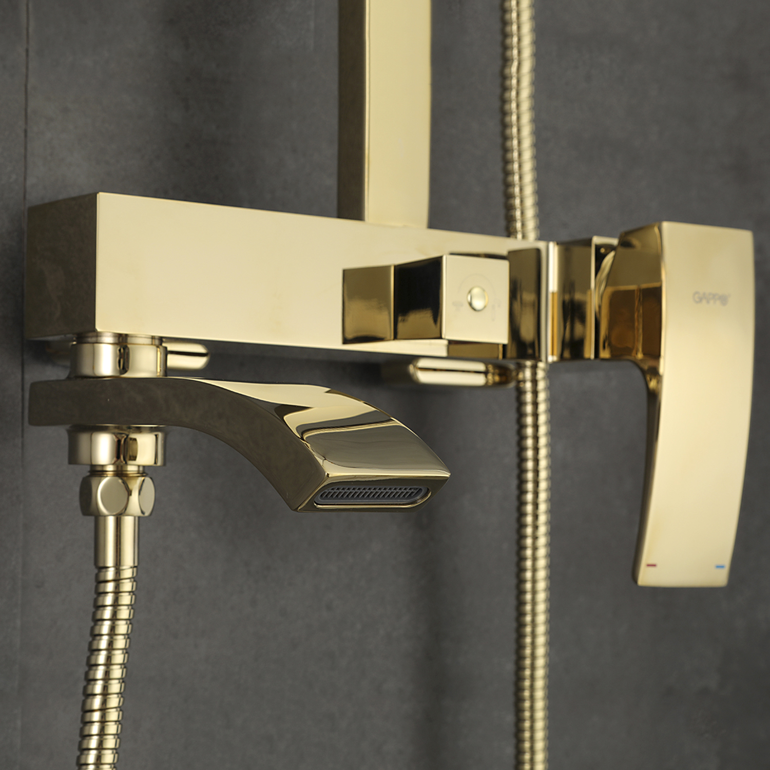 Комплектациясмеситель, душевая стойка, верхний душ, душевая лейка, душевой шланг, держатель для душевой лейки, настенный держатель, отражатели, эксцентрики