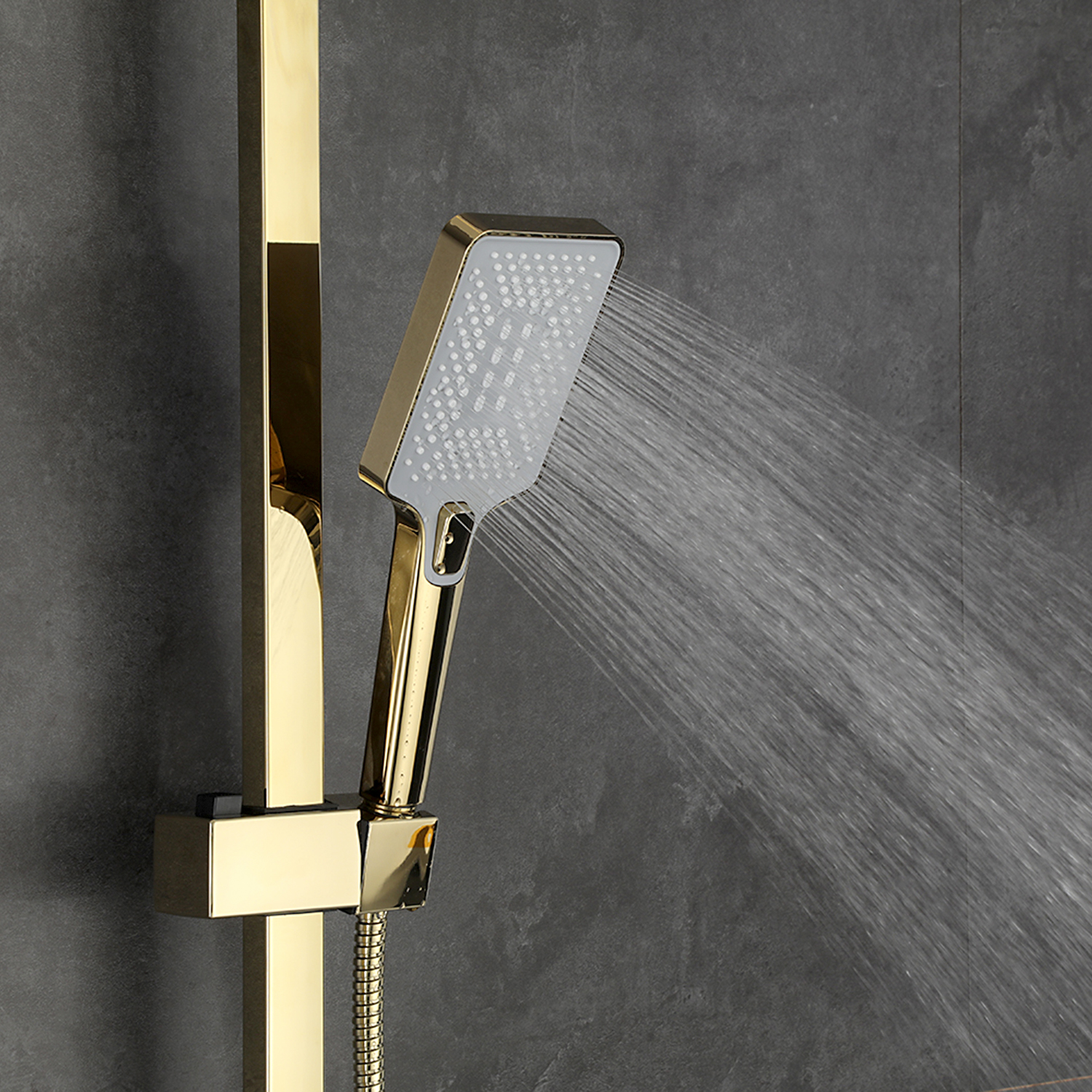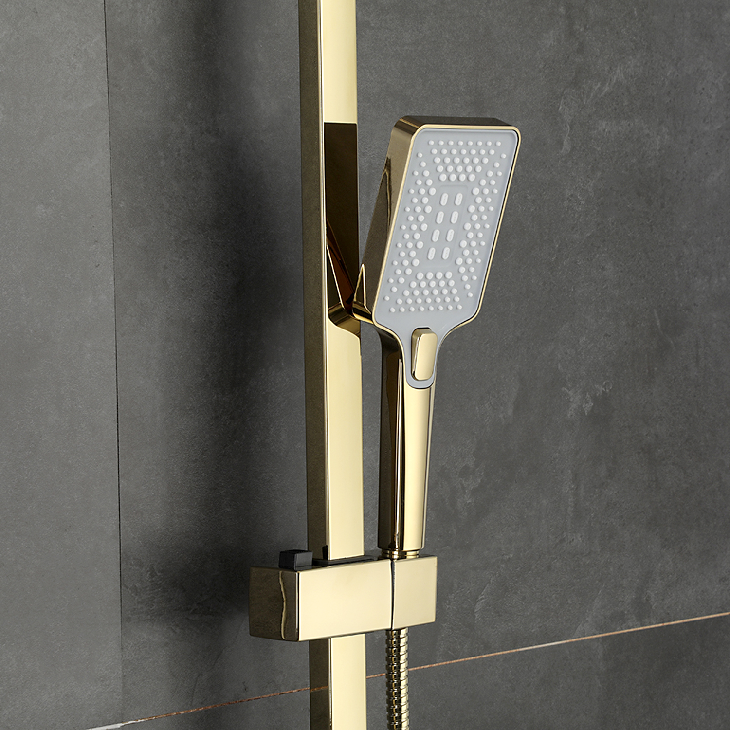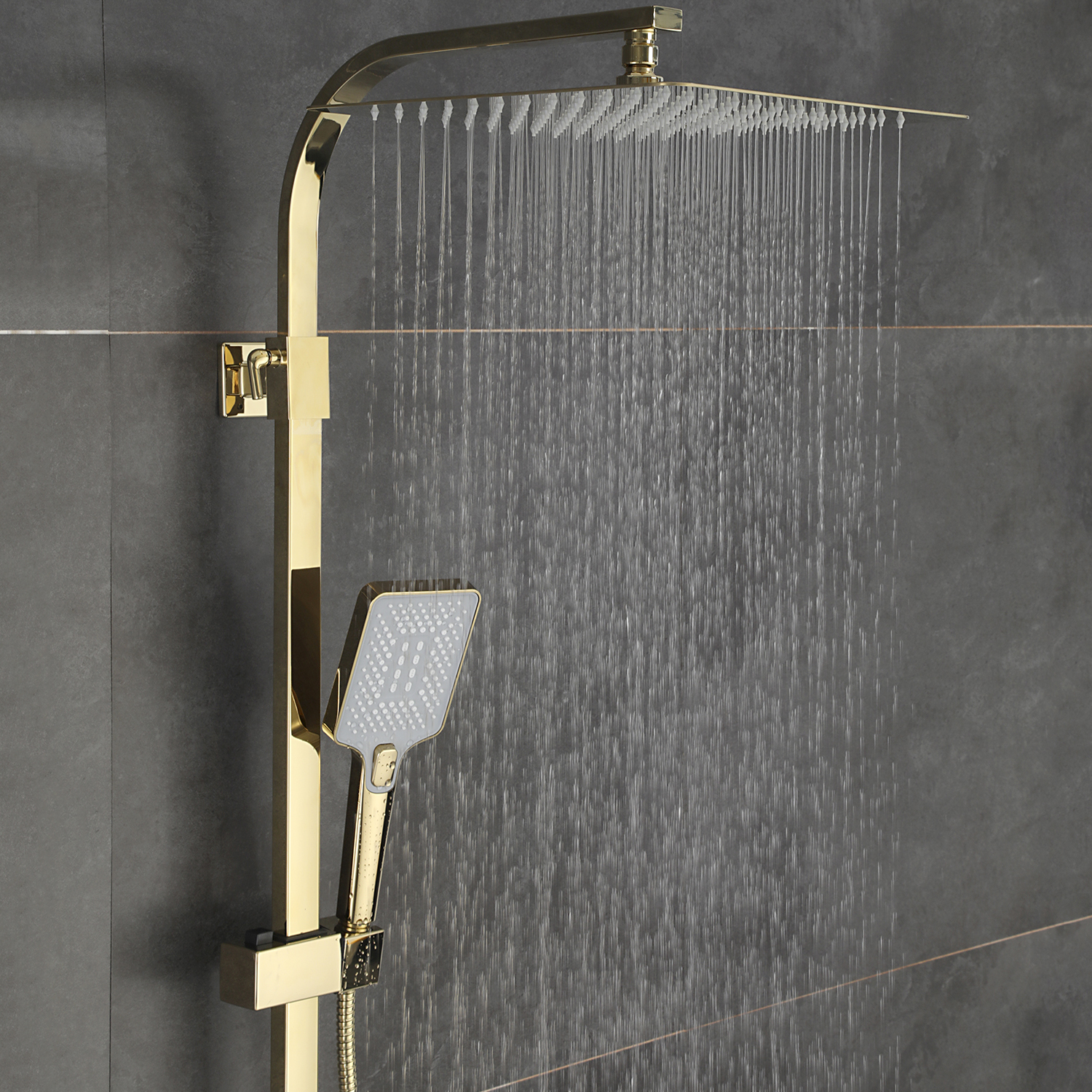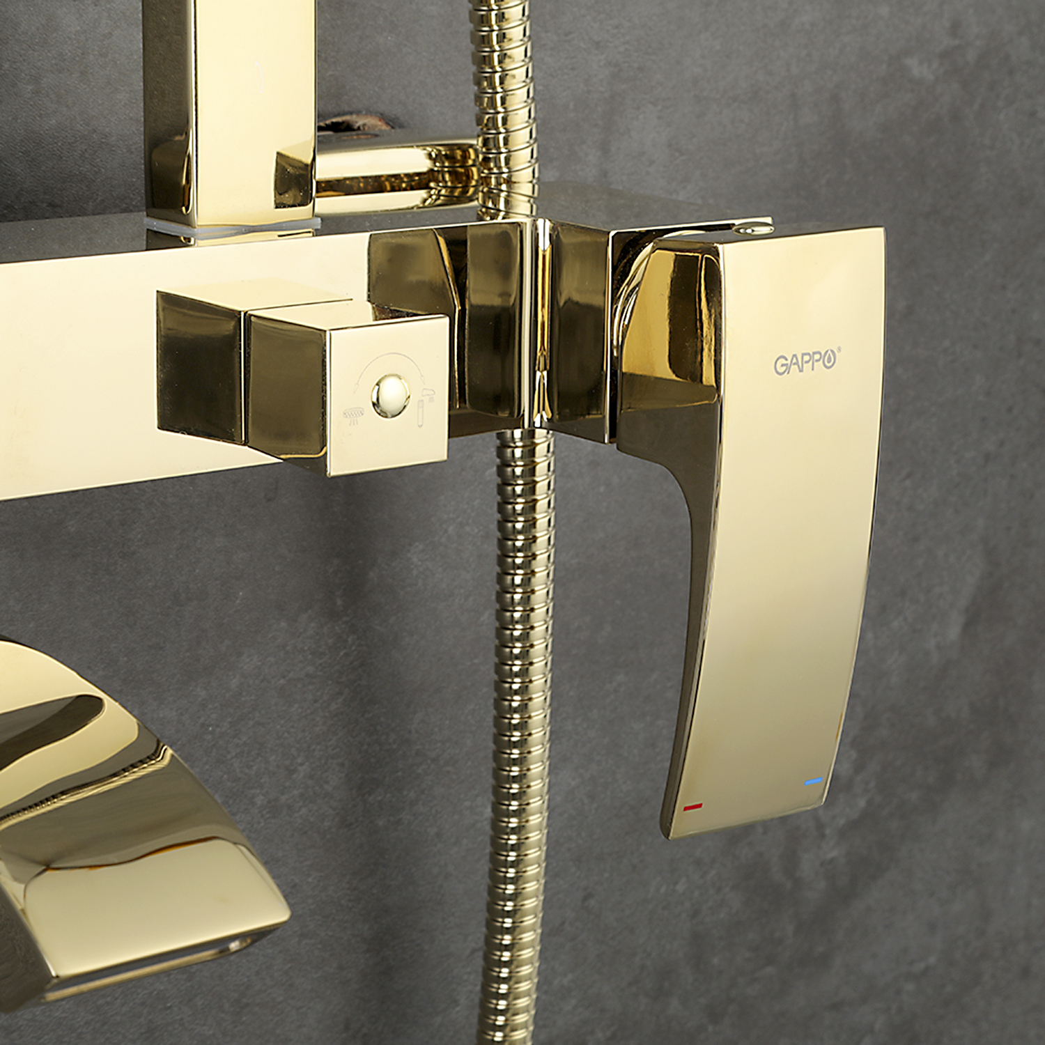 Комплектациясмеситель, душевая стойка, верхний душ, душевая лейка, душевой шланг, держатель для душевой лейки, настенный держатель, отражатели, эксцентрики