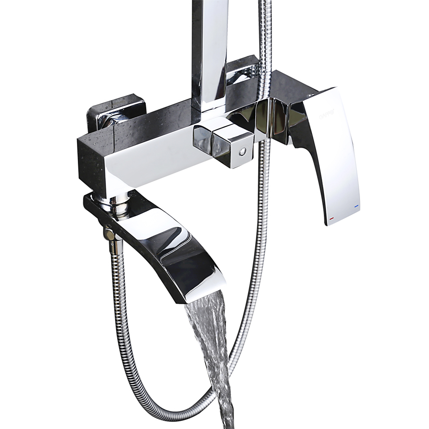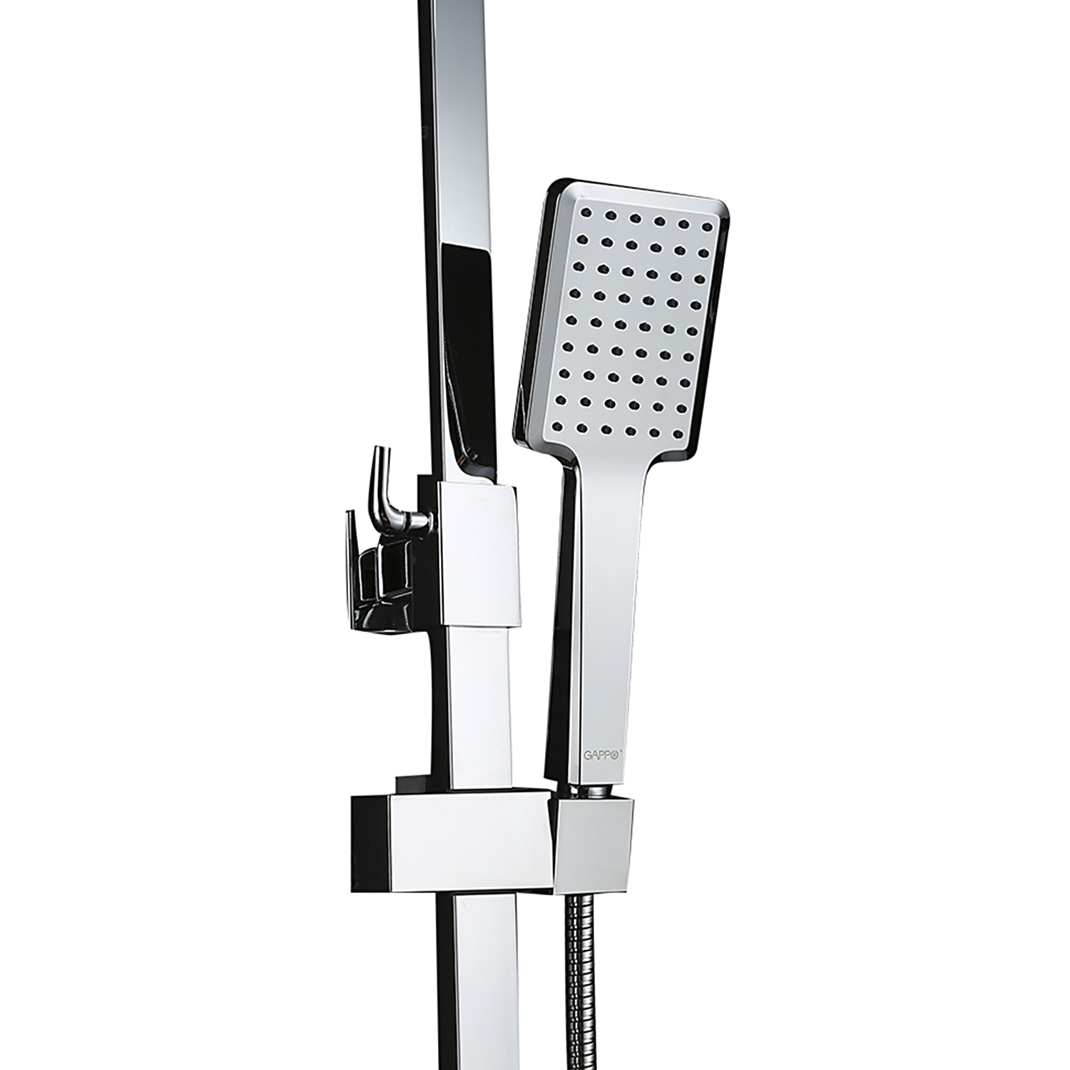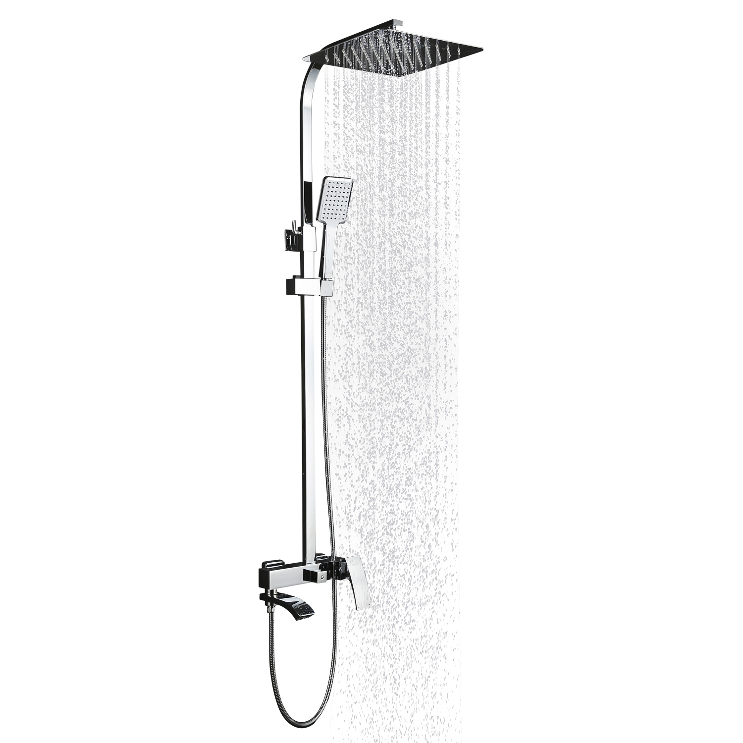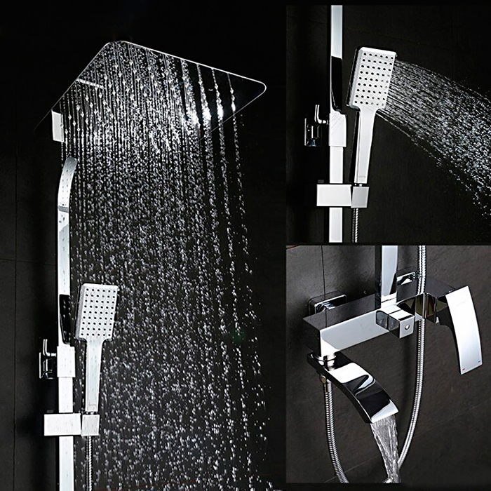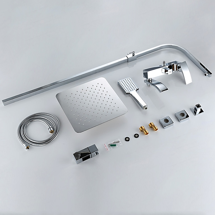 Комплектациясмеситель, душевая стойка, верхний душ, душевая лейка, душевой шланг, держатель для душевой лейки, настенный держатель, отражатели, эксцентрики