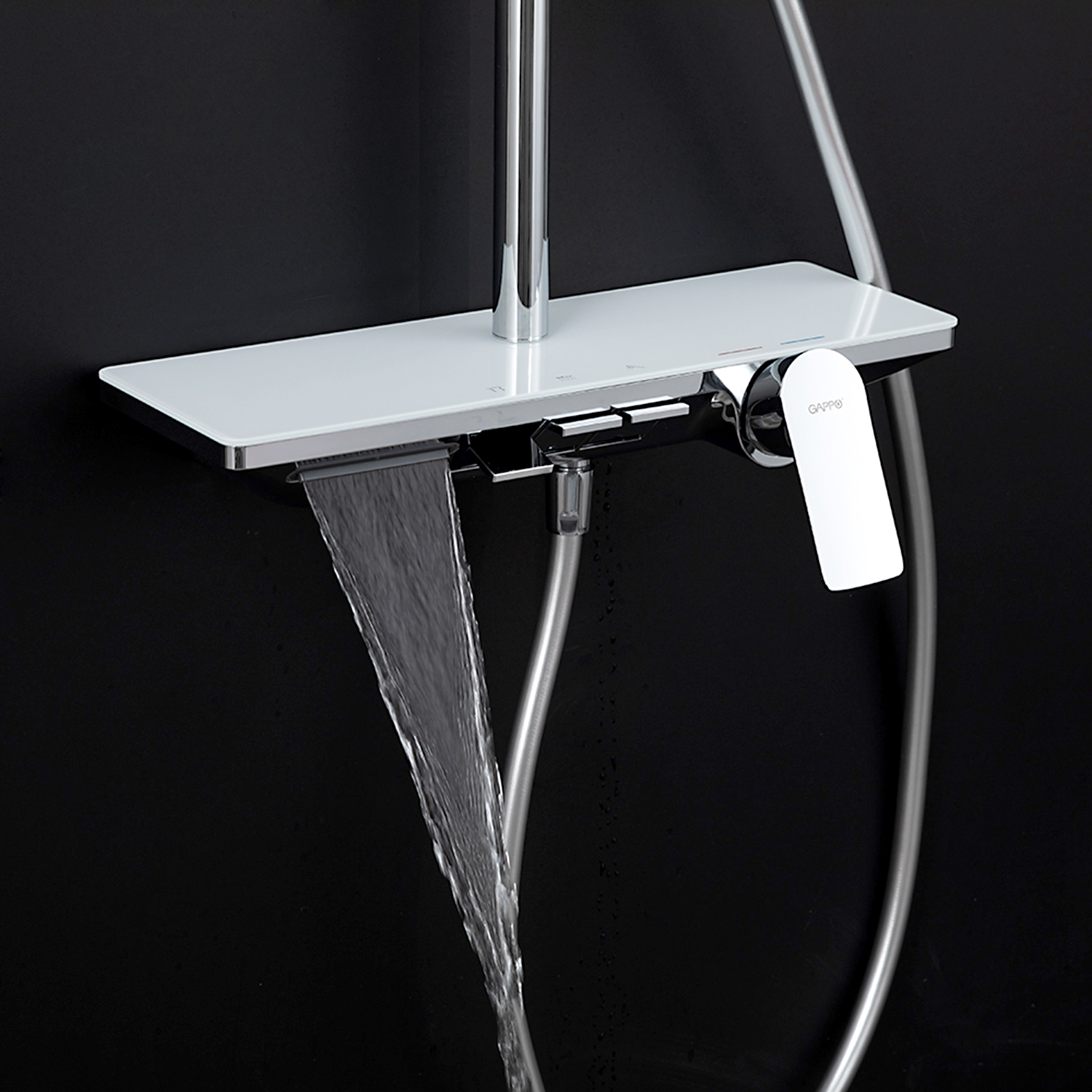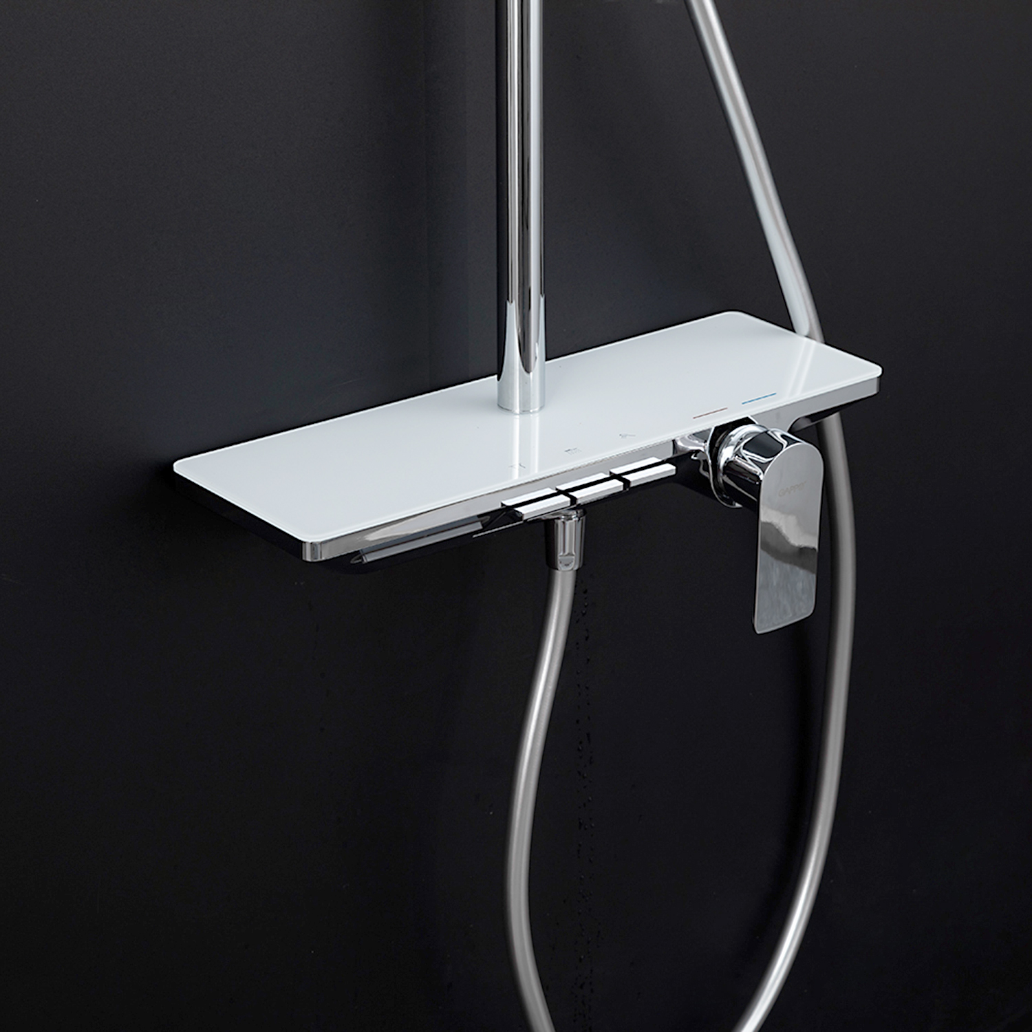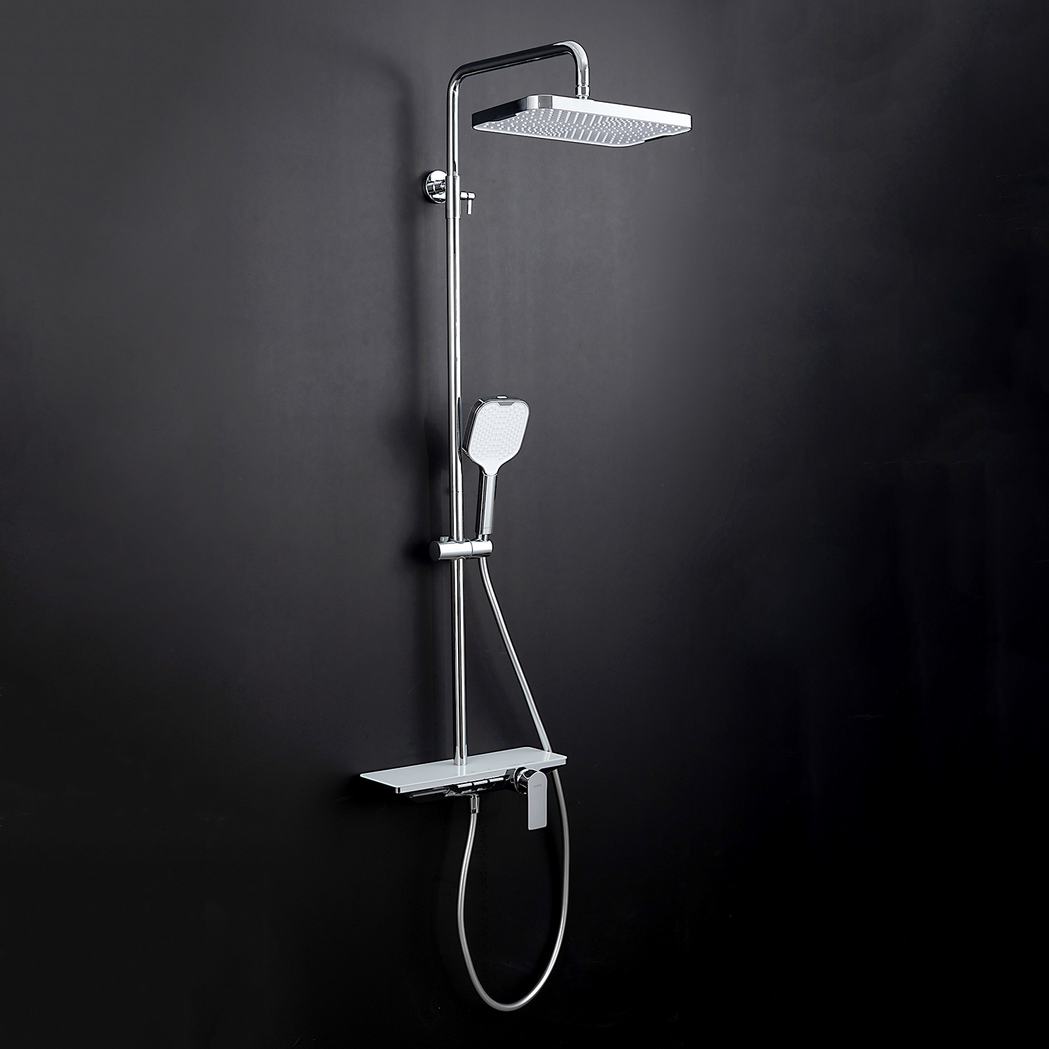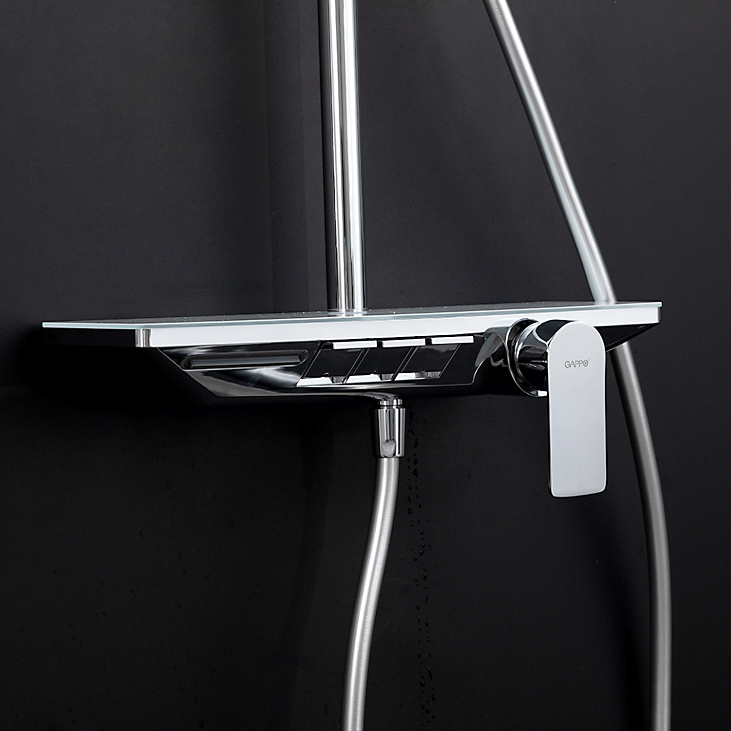 ХарактеристикиМатериал: полка-пластик, верхняя часть полки – стекло / форсунки душевой лейки и верхнего душа – силикон.
