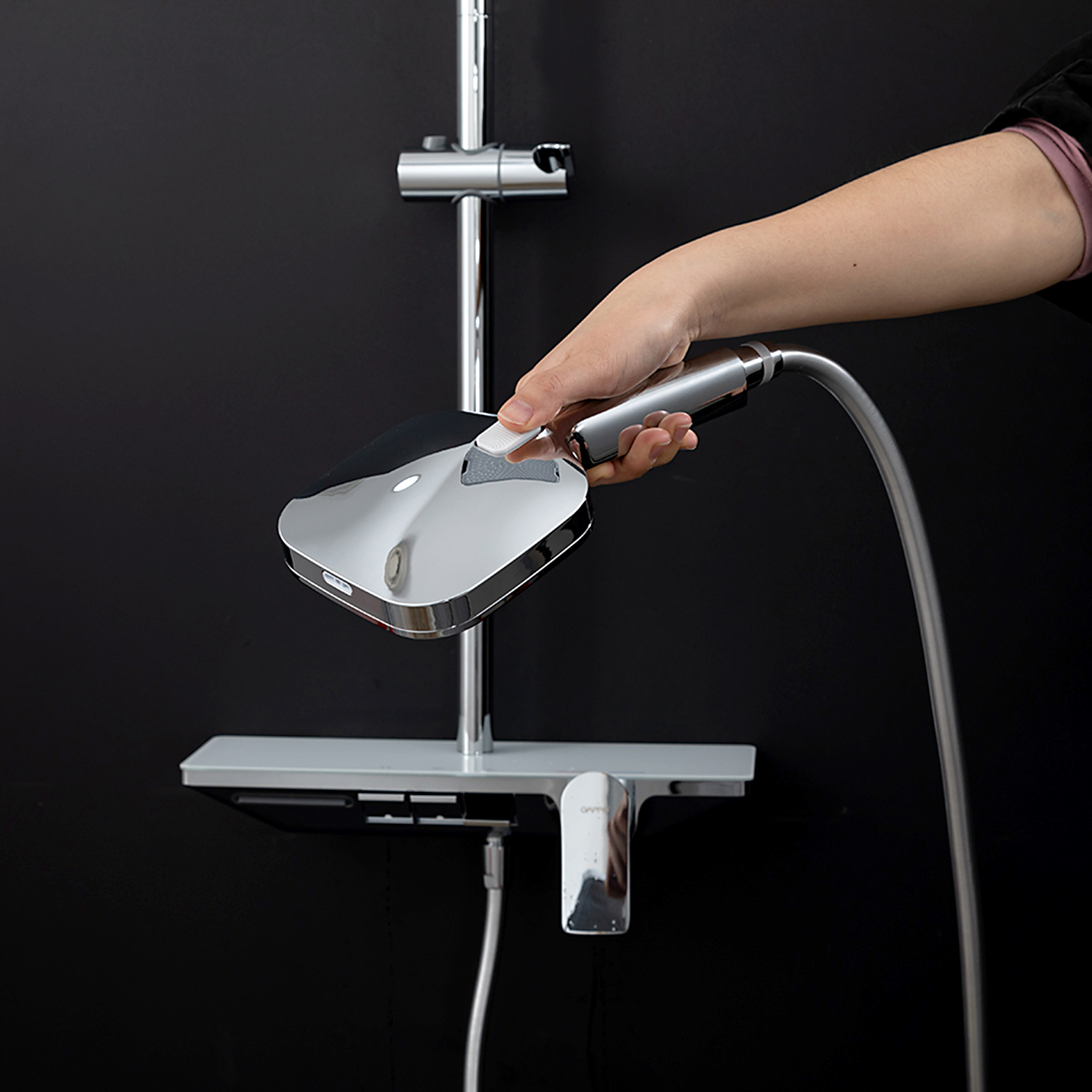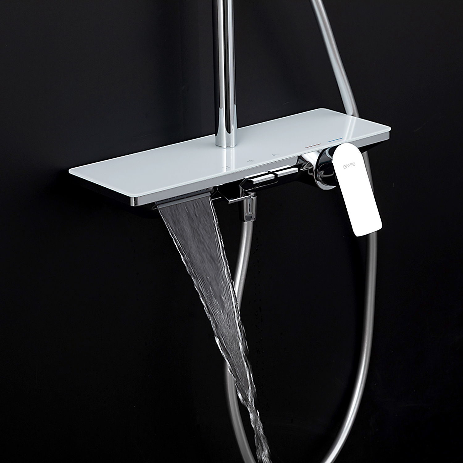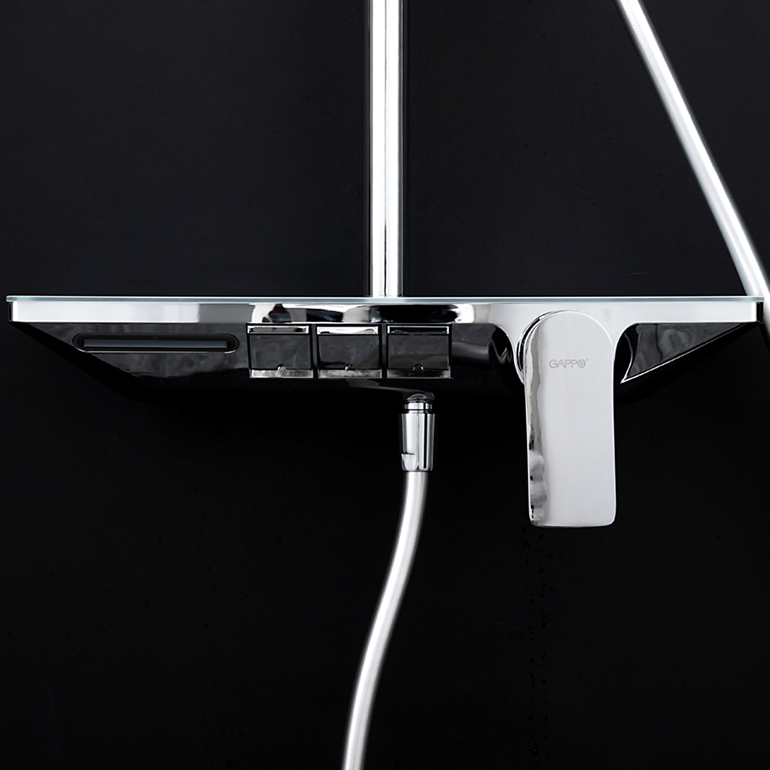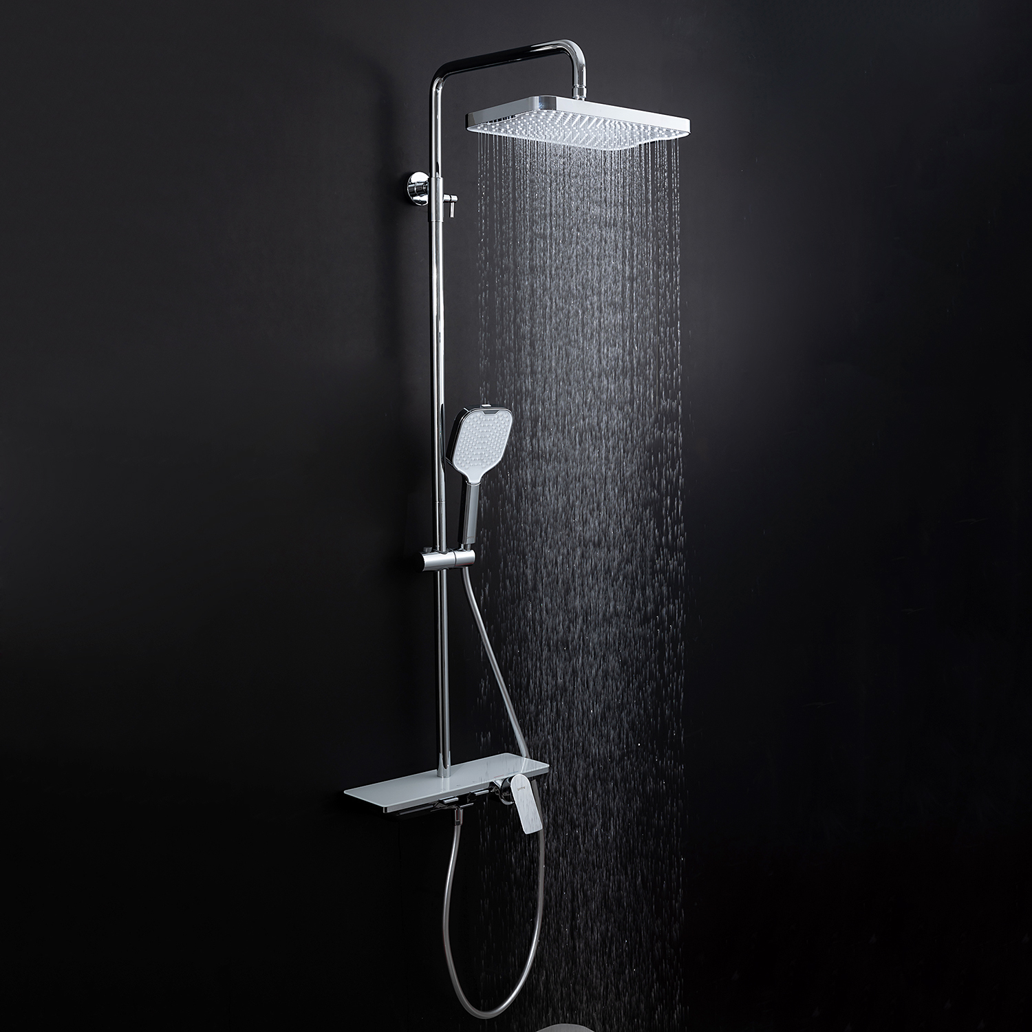 ХарактеристикиМатериал: полка-пластик, верхняя часть полки – стекло / форсунки душевой лейки и верхнего душа – силикон.