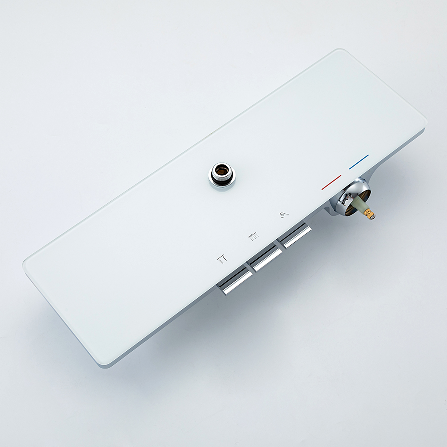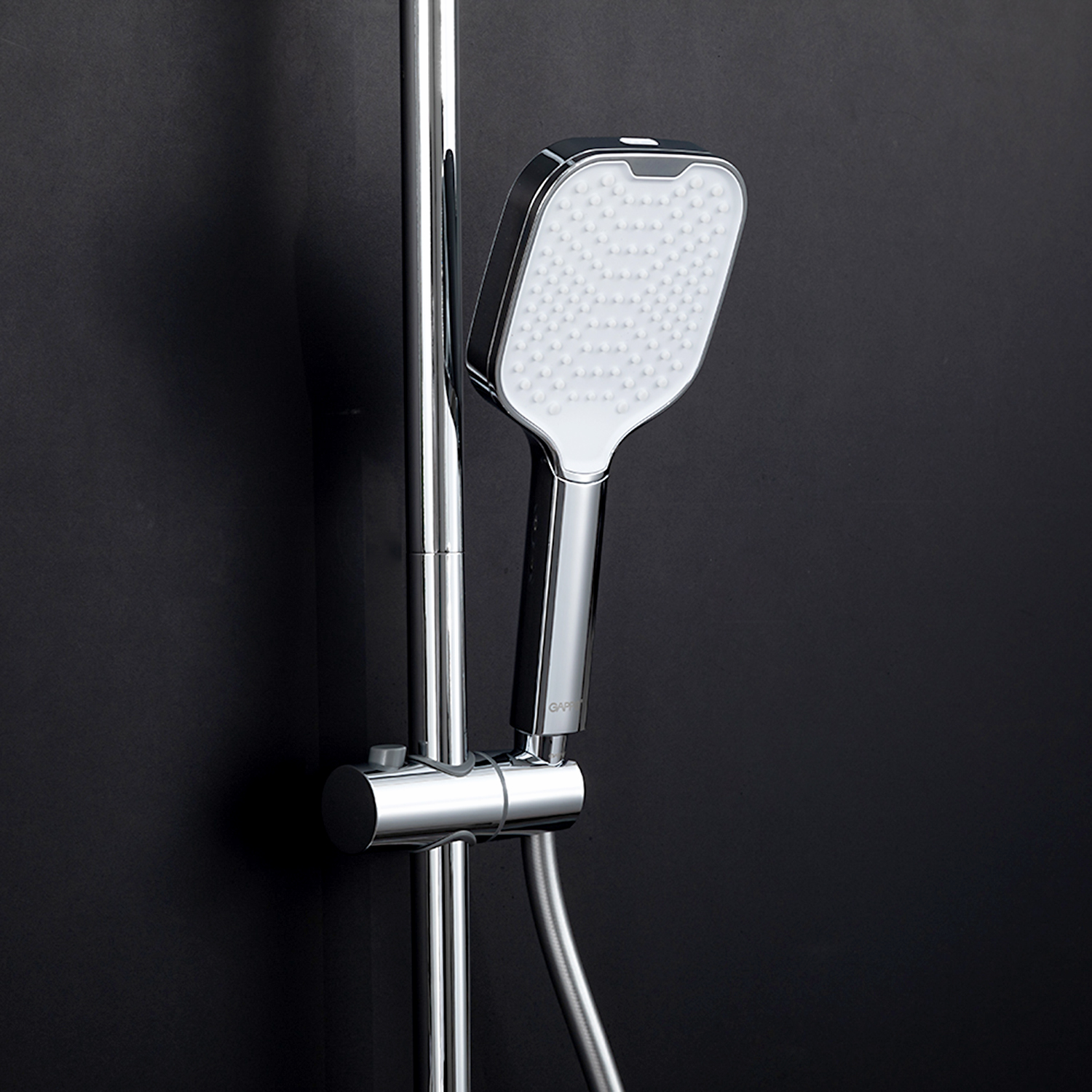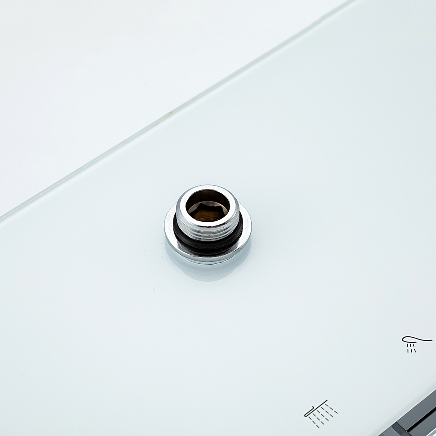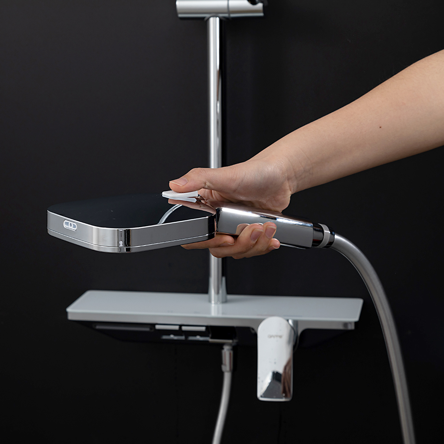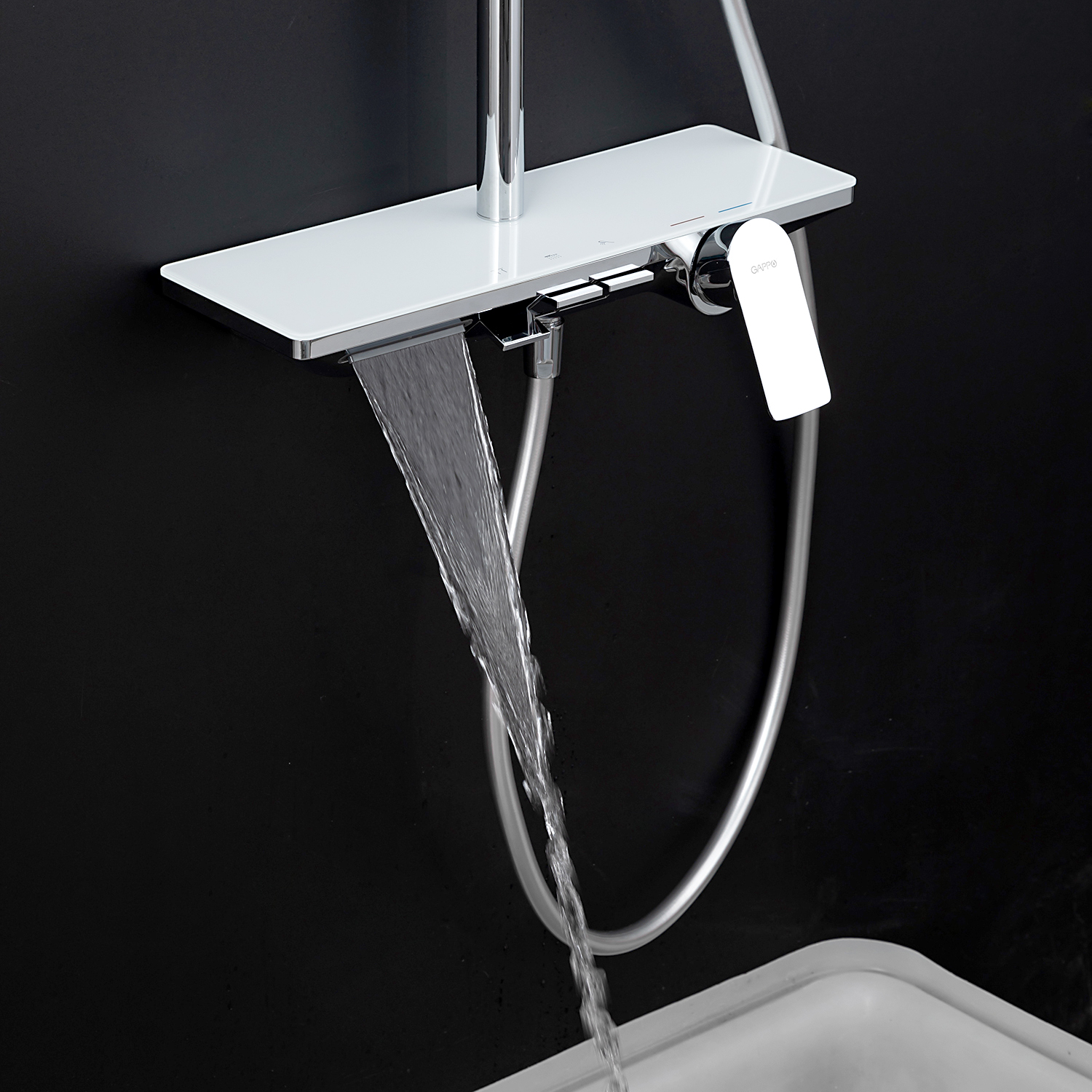 ХарактеристикиМатериал: полка-пластик, верхняя часть полки – стекло / форсунки душевой лейки и верхнего душа – силикон.