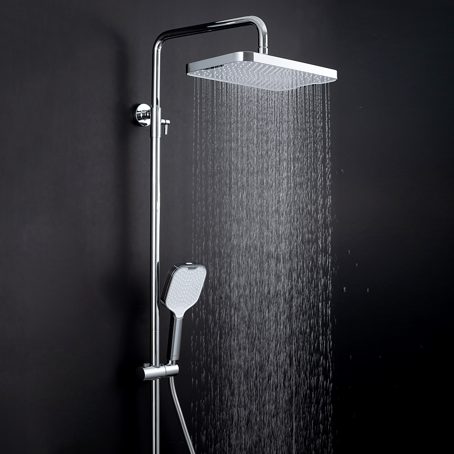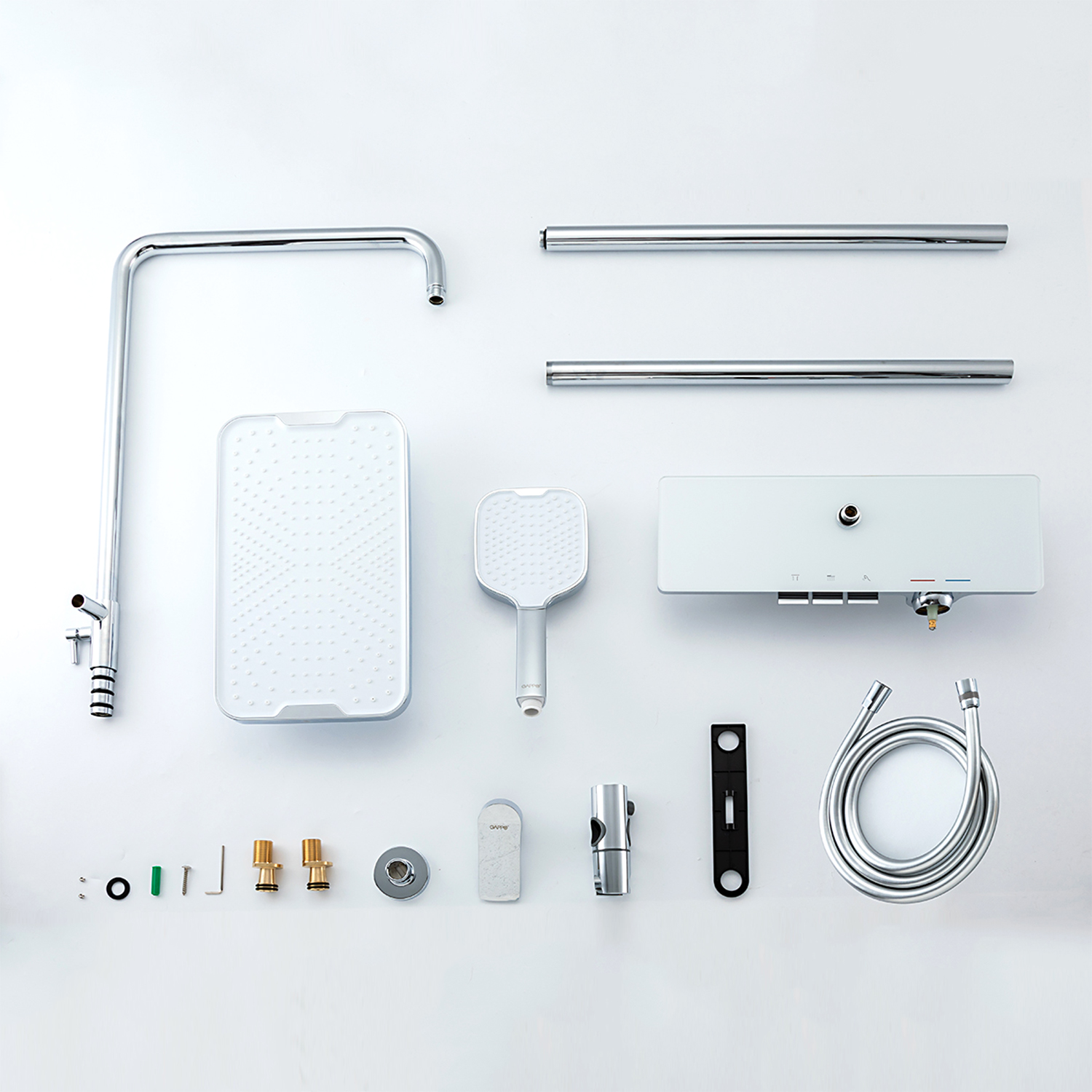 Комплектациясмеситель, душевая стойка, верхний душ, душевая лейка, душевой шланг, держатель для душевой лейки, настенный держатель, отражатели, эксцентрики
