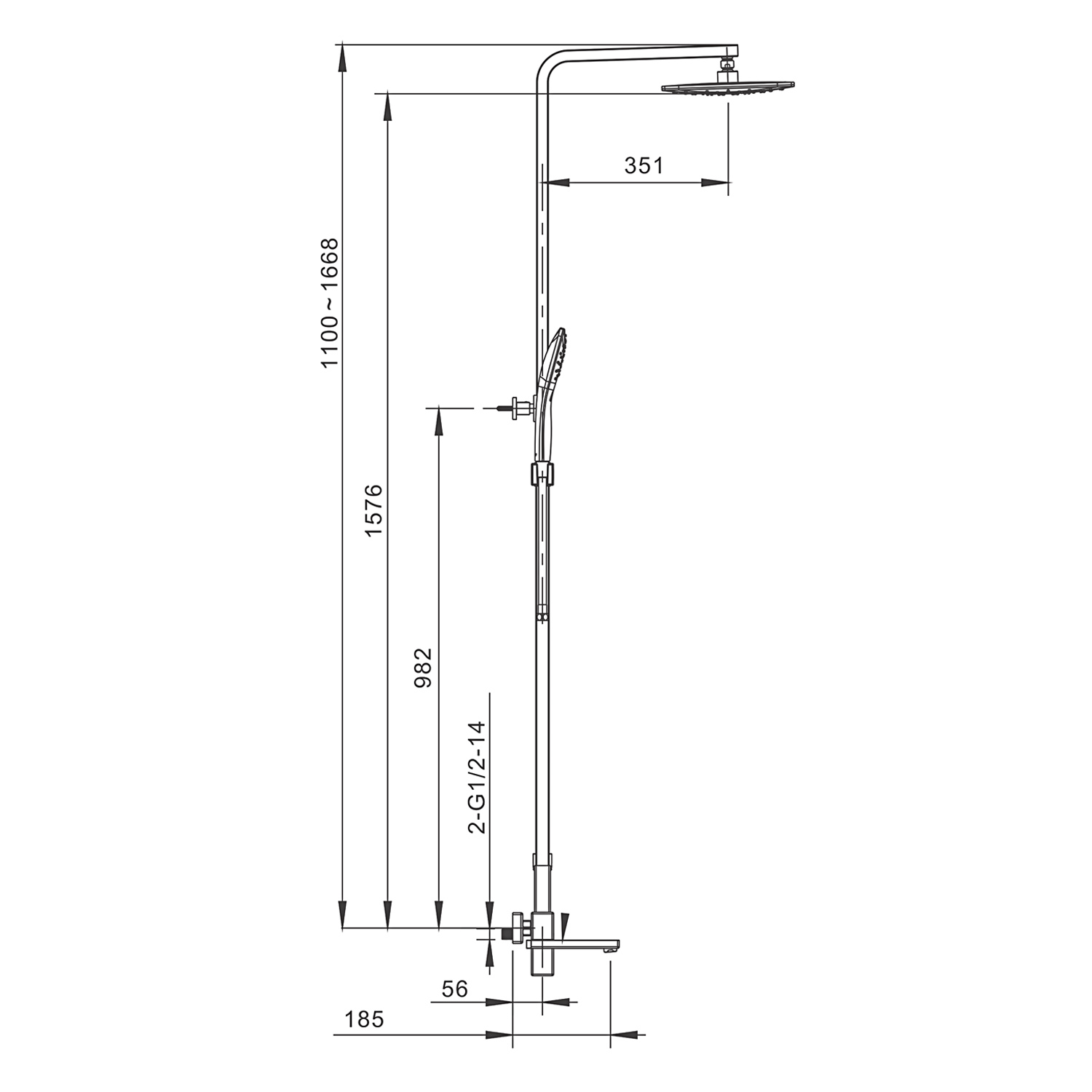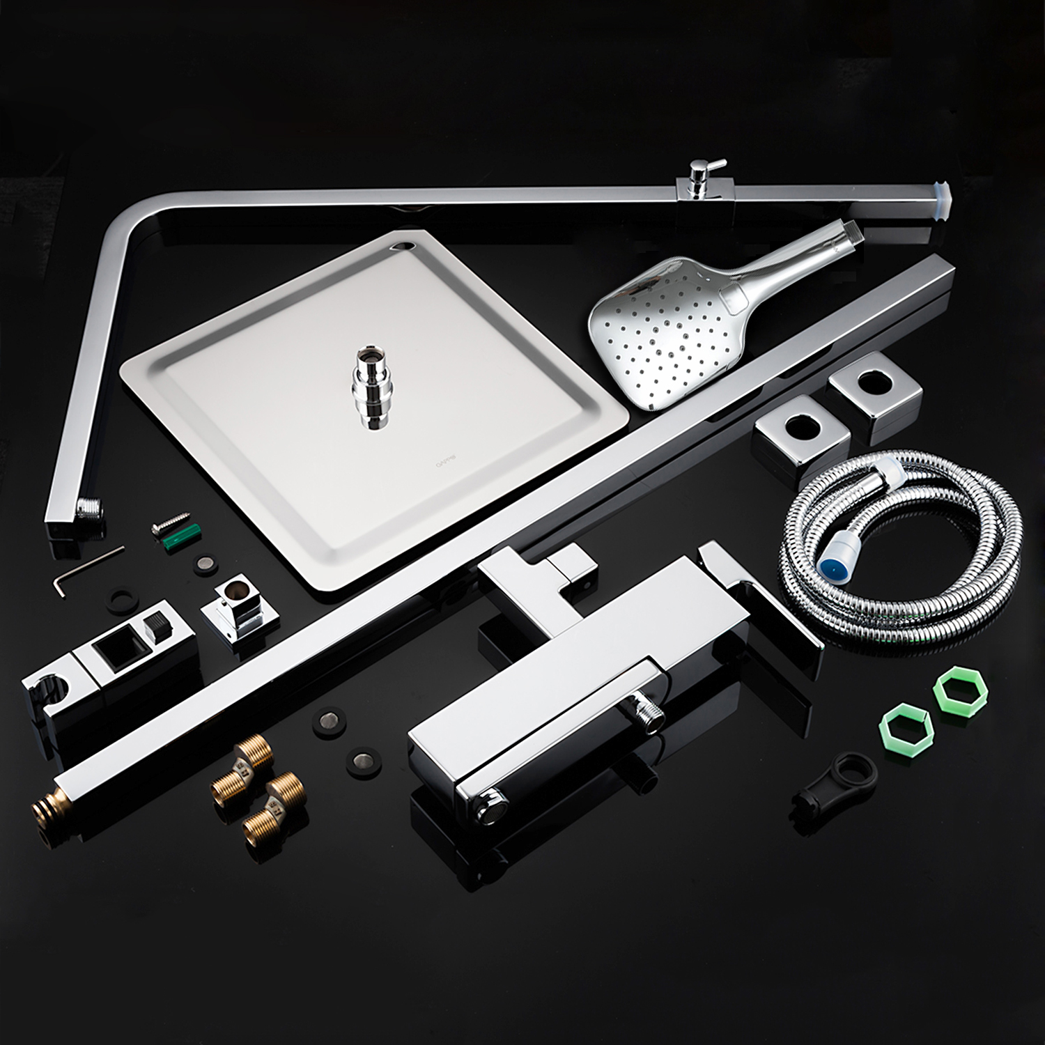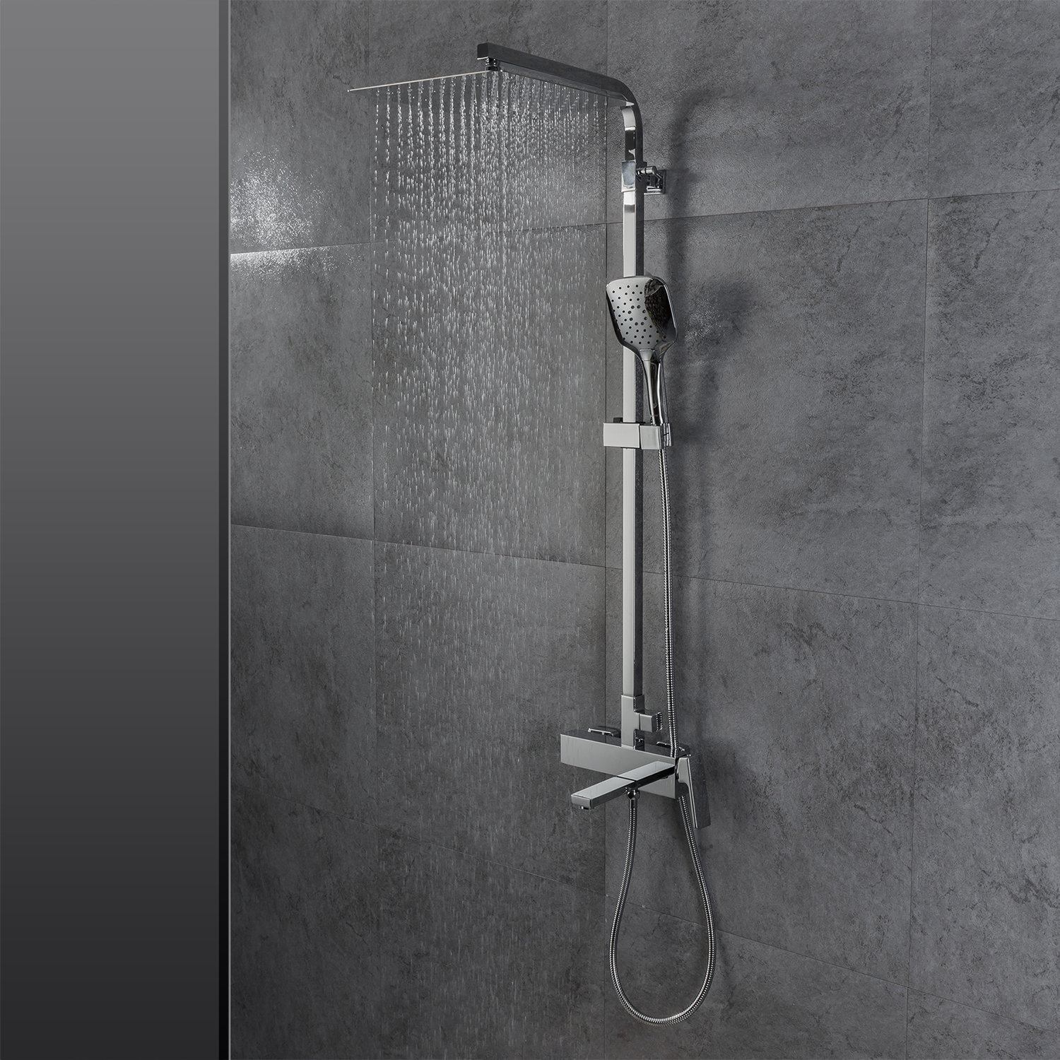Комплектациясмеситель, душевая стойка, верхний душ, душевая лейка, душевой шланг, держатель для душевой лейки, настенный держатель, отражатели, эксцентрики